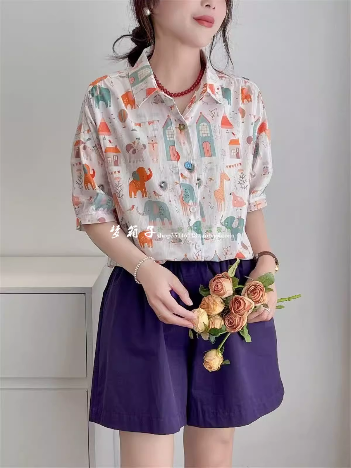 - Áo sơ mi cotton in hình động vật hoạt hình mùa hè Dream Box 2025, cổ trụ, tay ngắn, dáng rộng, trẻ trung dành cho nữ