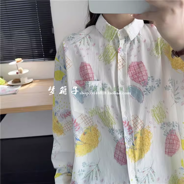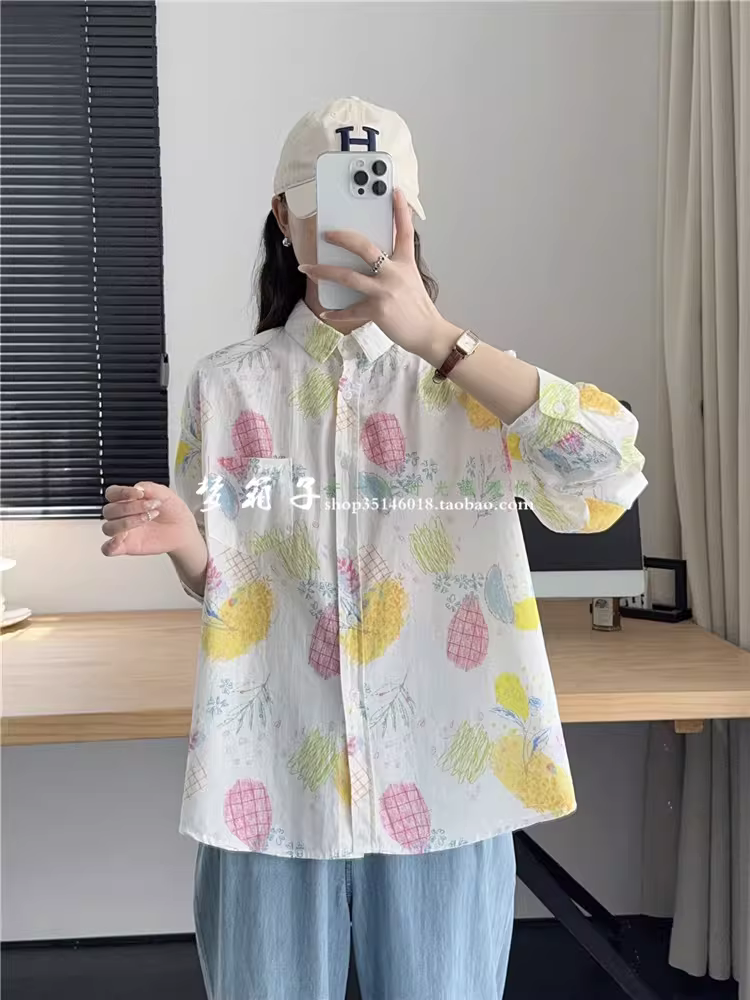Áo sơ mi cotton in hình dứa ngọt mùa thu mới Dream Box 2024, cổ trụ, tay dài, dáng rộng, phong cách thường ngày