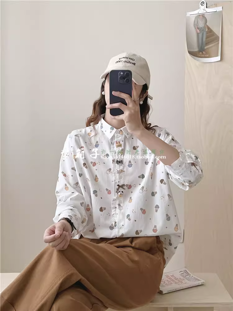 Áo sơ mi cotton in hình kem hoạt hình Dream Box 2025 mùa xuân mới, cổ sơ mi, tay dài, viền xếp ly, dáng rộng.