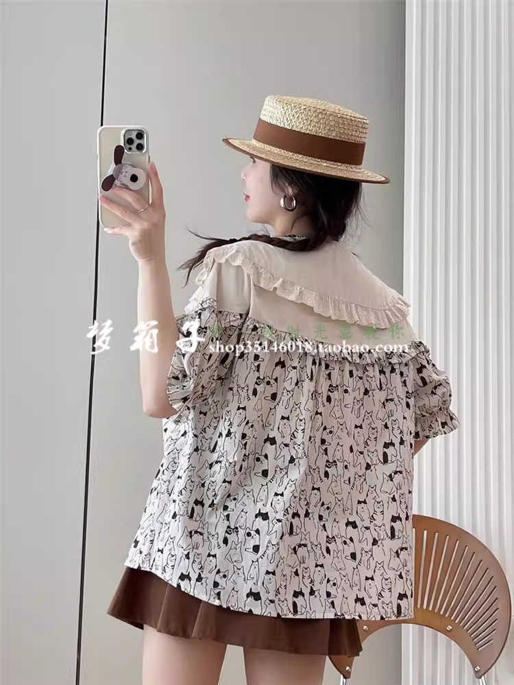 - Áo sơ mi cotton in hình nhiều chú mèo hoạt hình mùa hè mới Dream Box 2024, cổ áo búp bê ren, tay ngắn bèo nhún