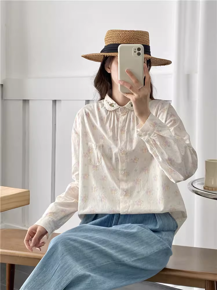 - Áo sơ mi cotton in hoa mùa xuân Dream Box 2024, cổ thêu, tay dài, dáng rộng, kiểu ngọt ngào dành cho nữ