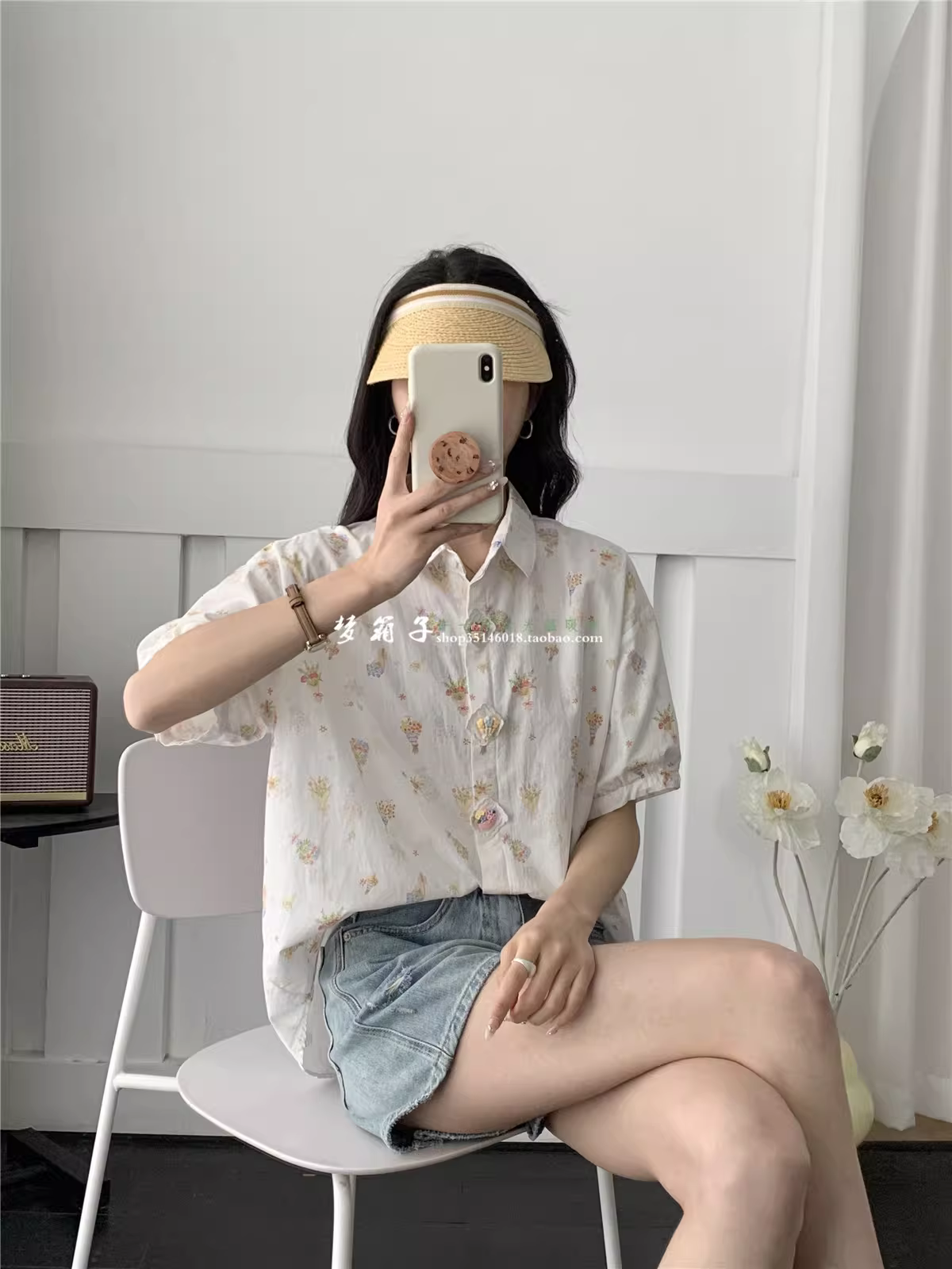 - Áo sơ mi cotton in họa tiết hoa tươi mới mùa hè Dream Box 2025, cổ trụ, tay áo trễ vai, tay ngắn, dáng rộng, áo giảm tuổi tác.