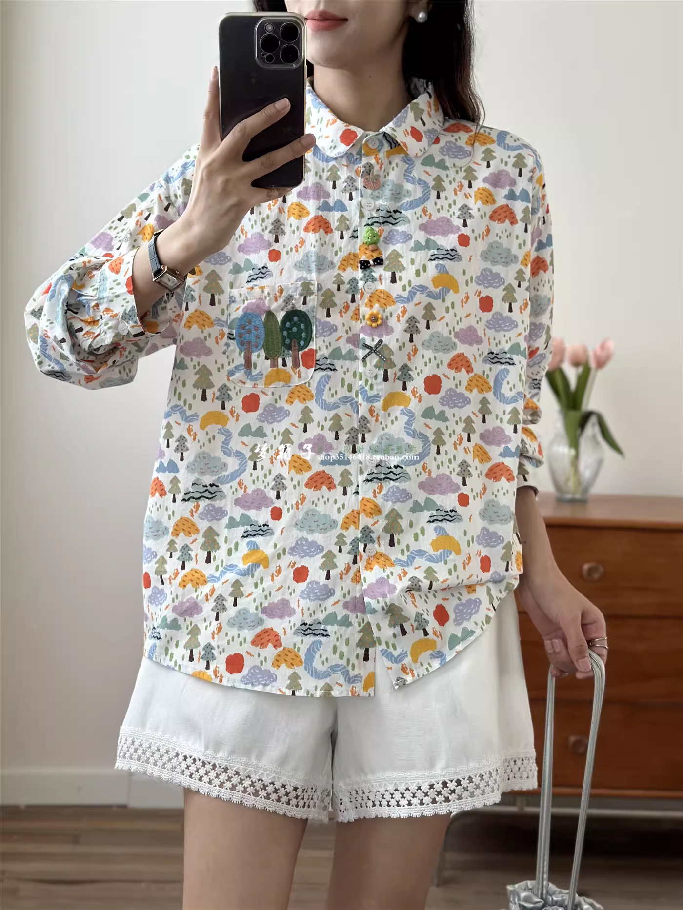 - Áo sơ mi cotton in họa tiết rừng mùa thu Dream Box 2025, cổ sơ mi, tay dài, thêu cây, dáng rộng, áo trẻ trung.