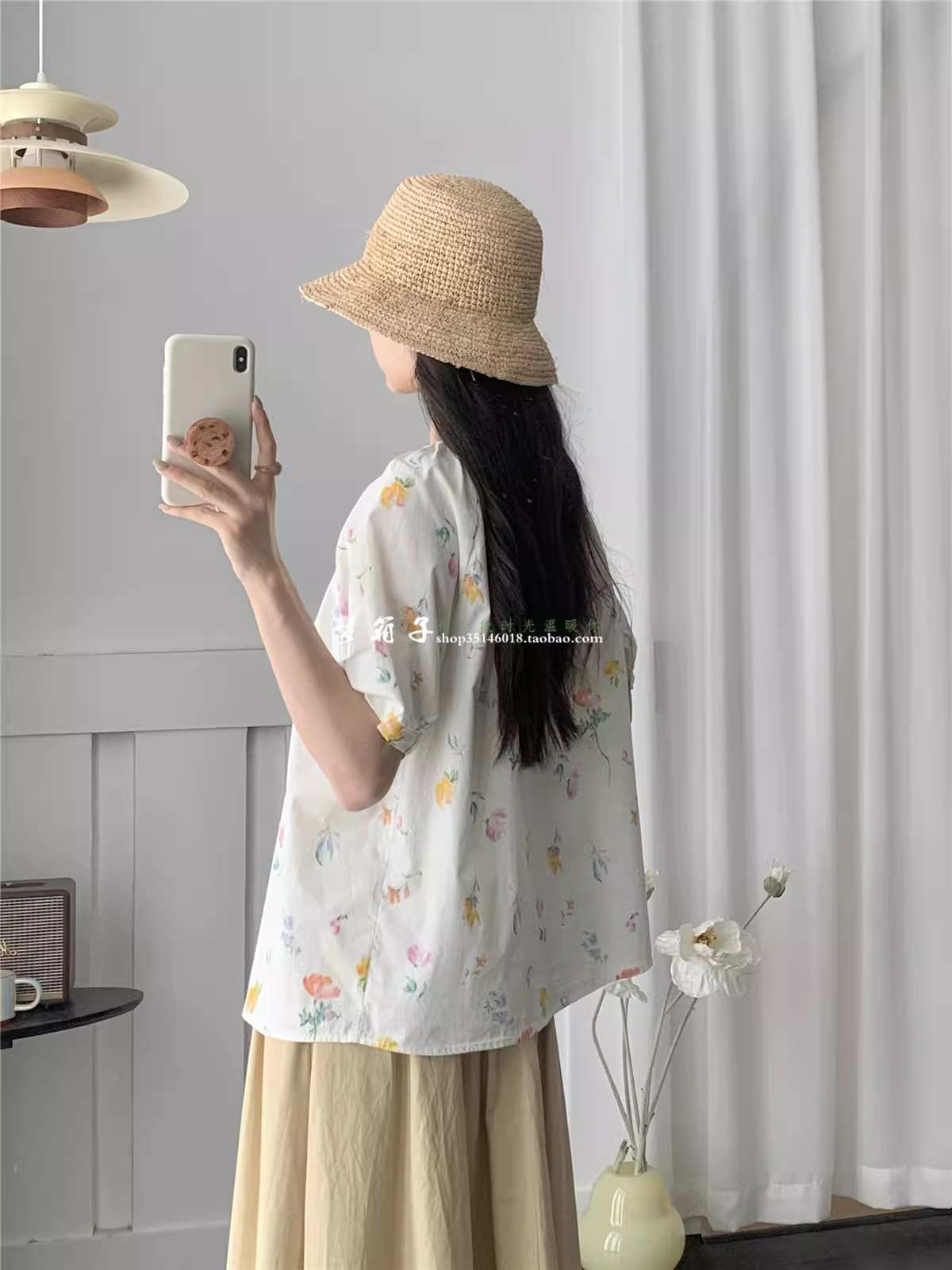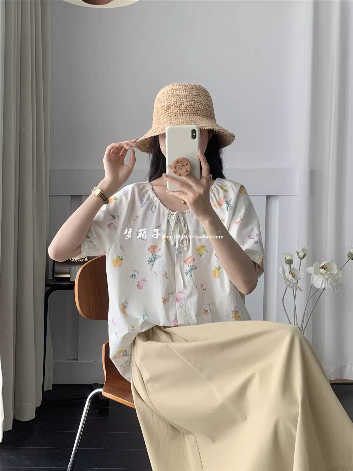 - Áo sơ mi cotton in hoa tươi mới mùa hè Dream Box 2025, cổ tròn, tay ngắn, dáng rộng, kiểu trẻ trung