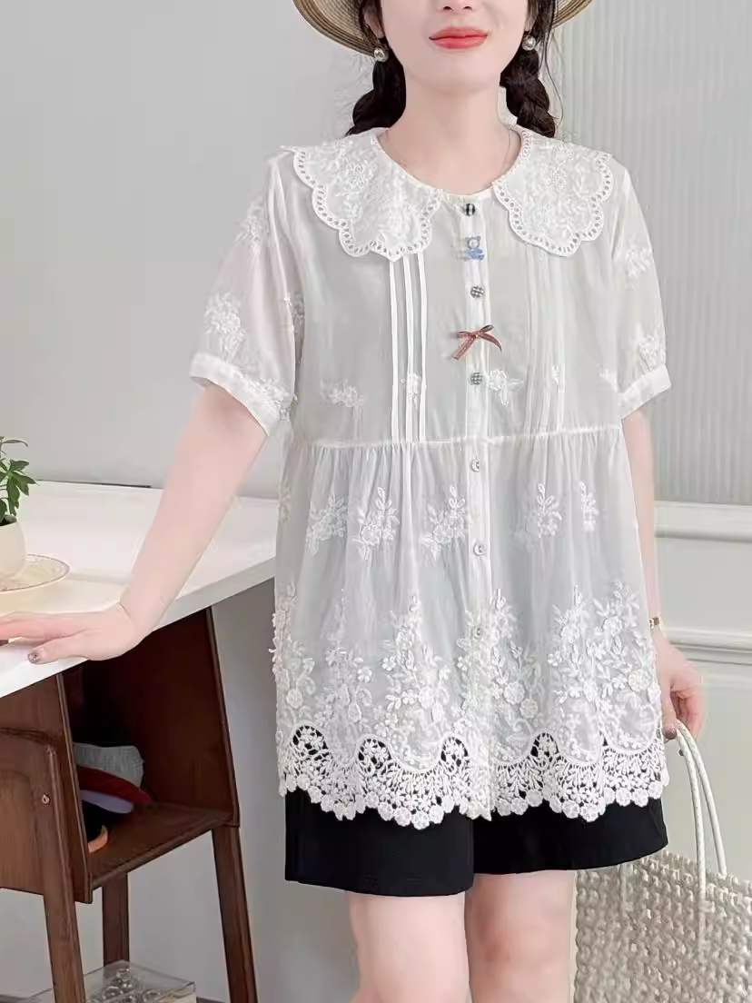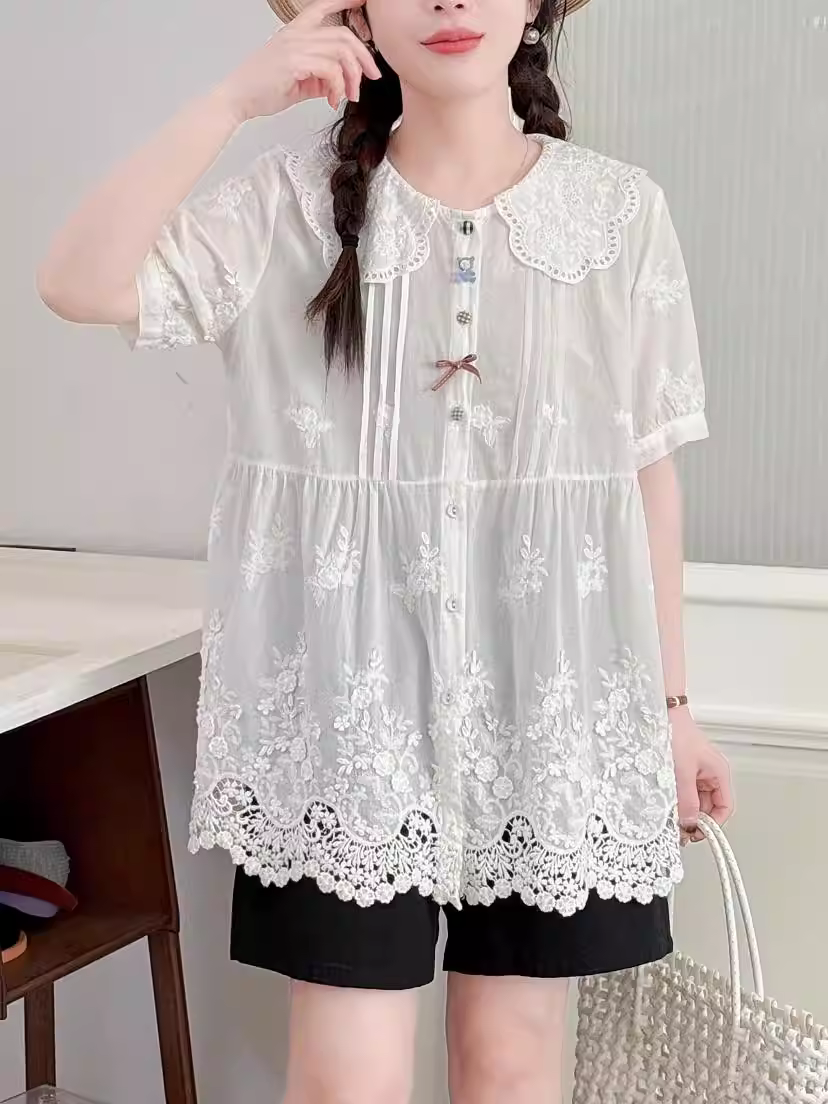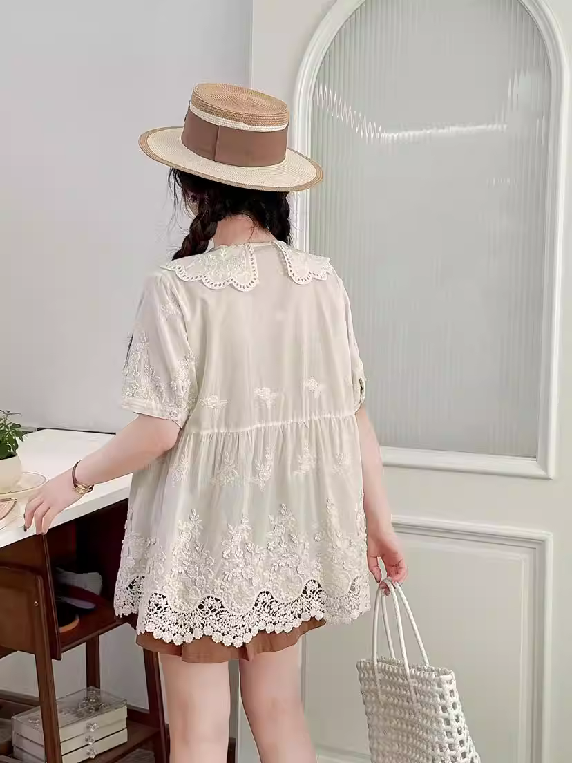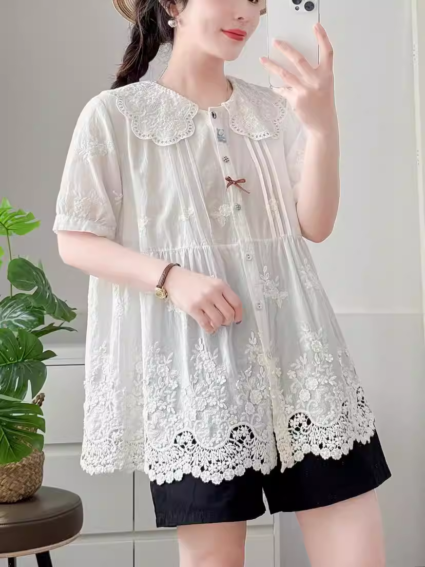 - Áo sơ mi cotton ren mùa hè Dream Box 2025, cổ ren thêu, tay ngắn, dáng rộng, kiểu áo babydoll, trẻ trung