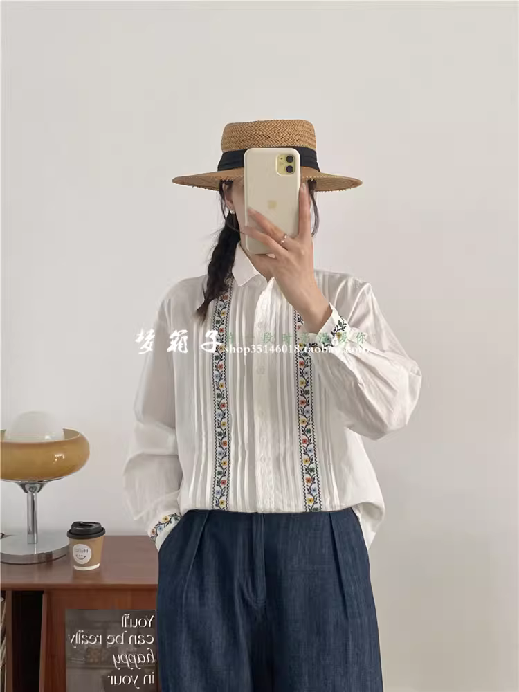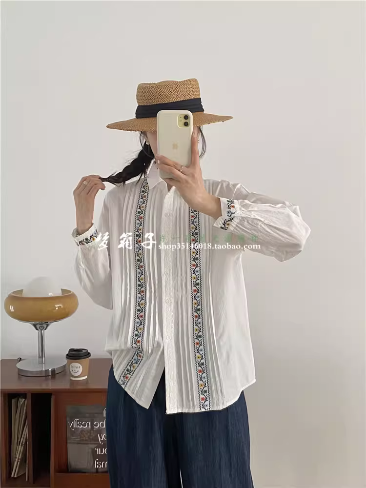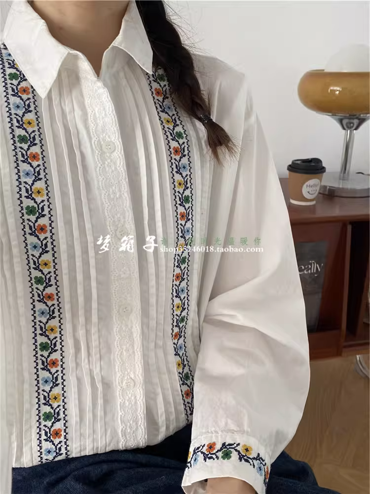 - Áo sơ mi cotton thêu chữ thập cổ điển mùa xuân 2025 Dream Box, cổ sơ mi, tay dài, xếp ly xếp nếp, dáng rộng, màu trắng.