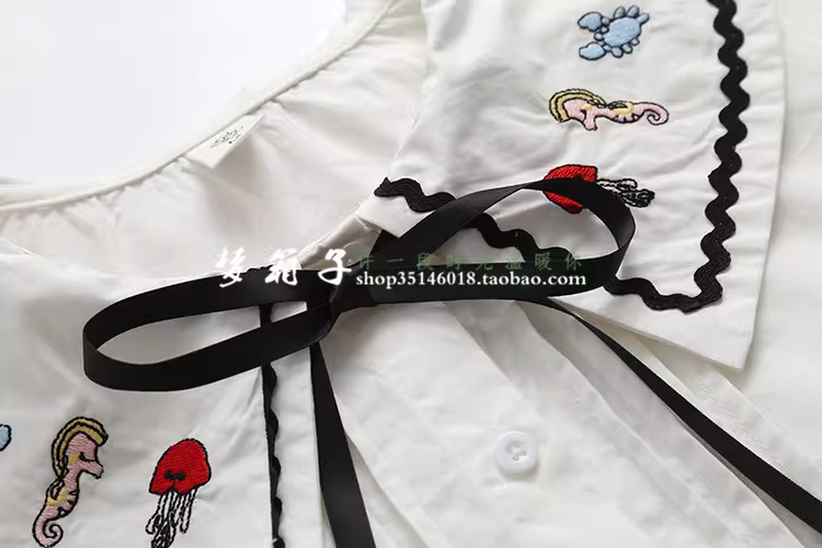 Áo sơ mi cotton thêu hình động vật biển phong cách mới Thu 2021 Dream Box, cổ búp bê, tay dài, dáng rộng, màu trắng dành cho nữ