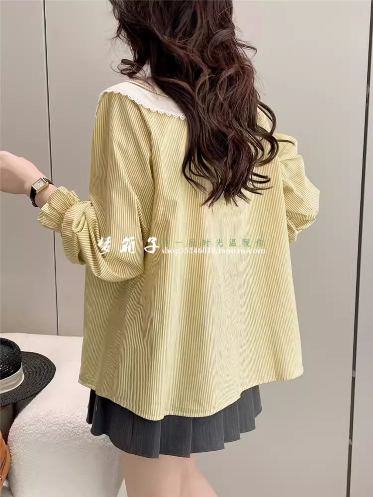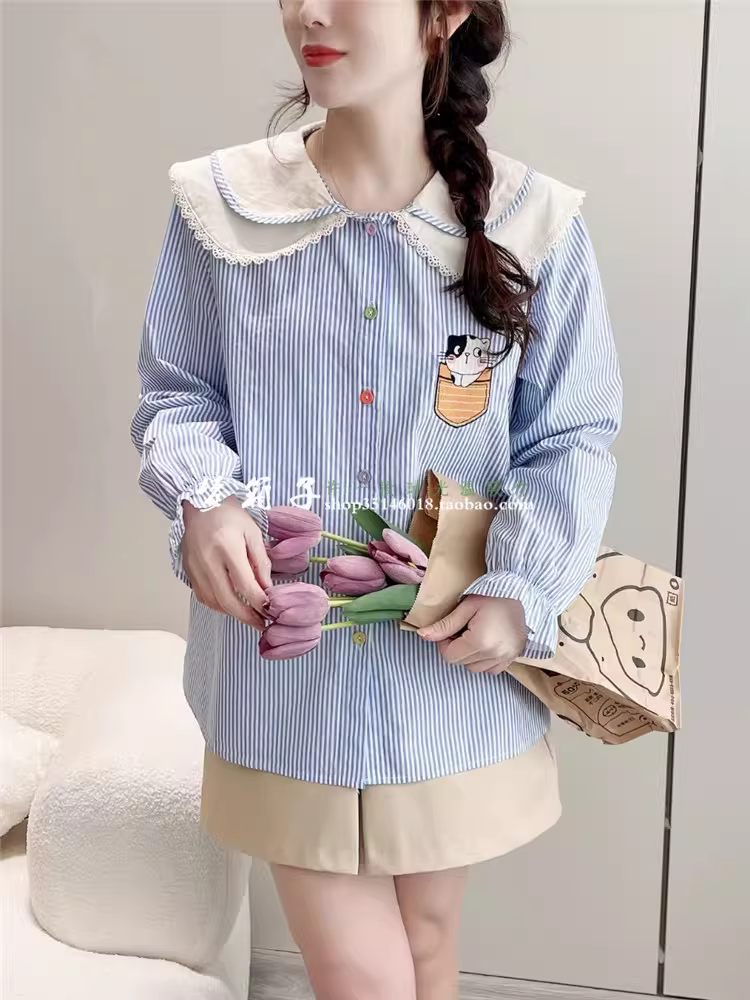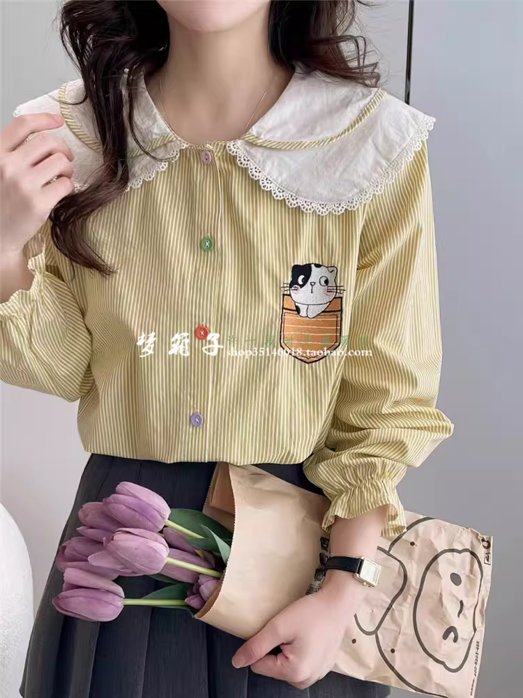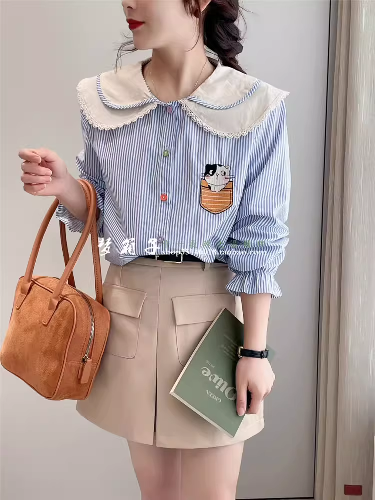 Áo sơ mi cotton thêu hình mèo Dream Box Xuân 2024, cổ búp bê hai lớp, tay dài, nhiều màu, cúc áo, dáng rộng, kẻ sọc