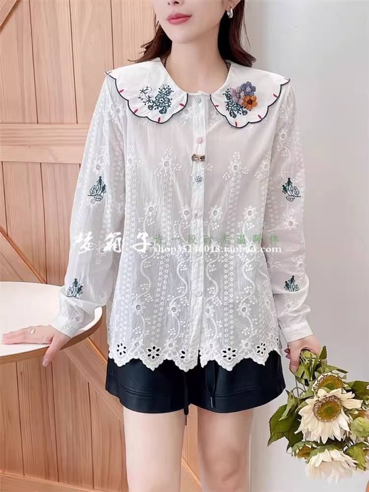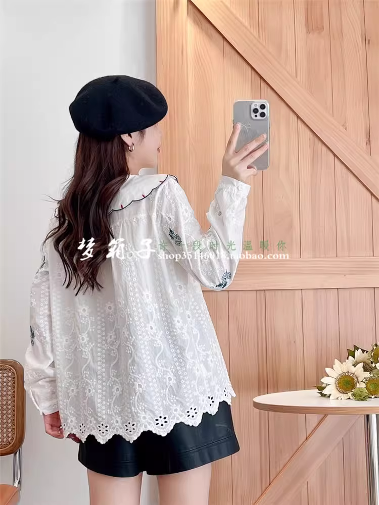 Áo sơ mi cotton thêu hoa mùa thu mới Dream Box 2024 dành cho nữ, cổ búp bê, tay dài, dáng rộng và ngọt ngào.