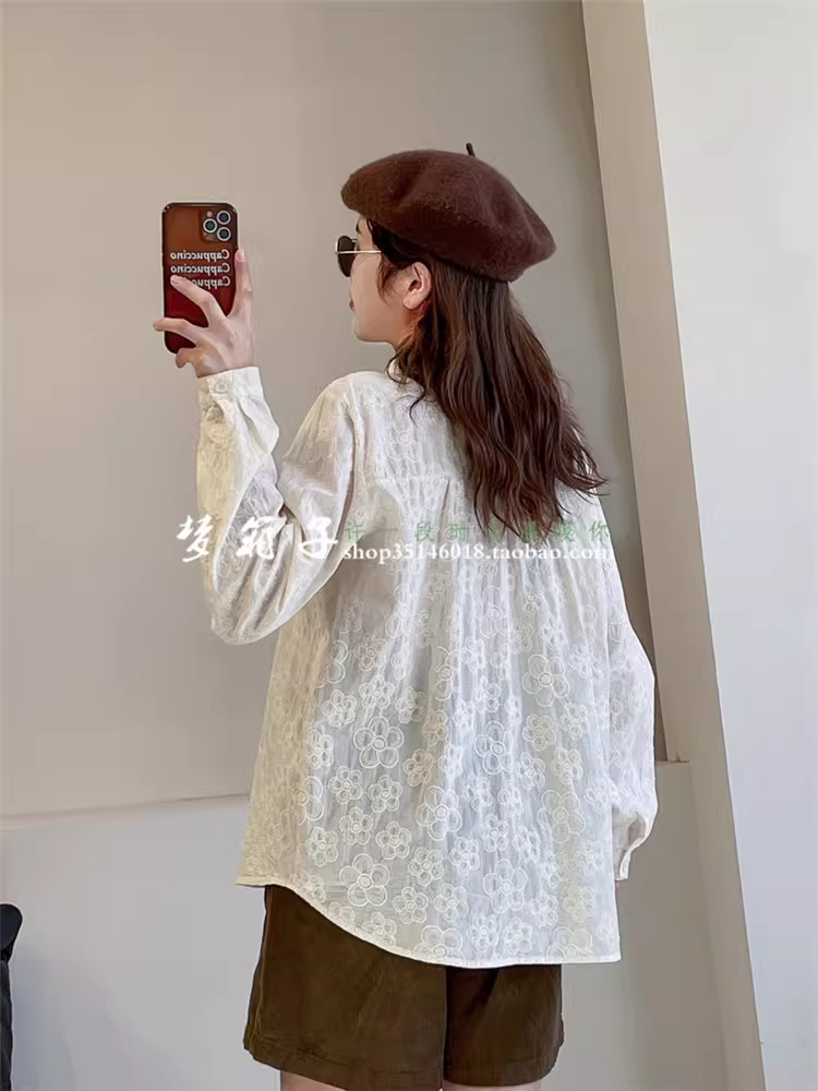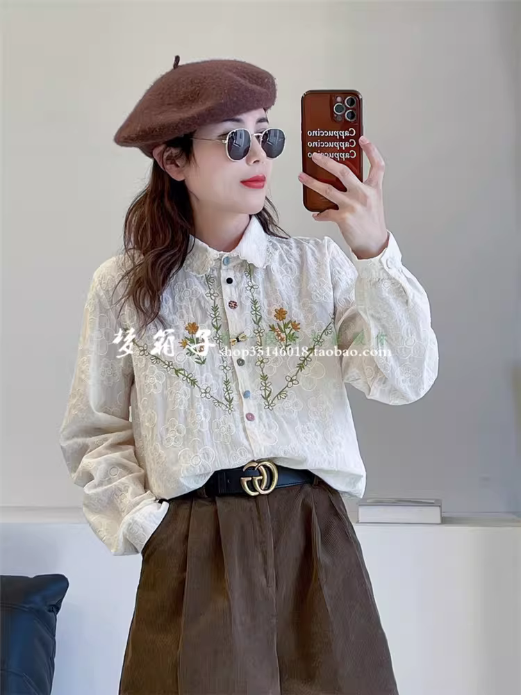 Áo sơ mi cotton thêu hoa tươi mới mùa thu Dream Box 2024 dành cho nữ, cổ trụ, tay dài, nhiều màu sắc, cúc áo, dáng rộng, thêu họa tiết