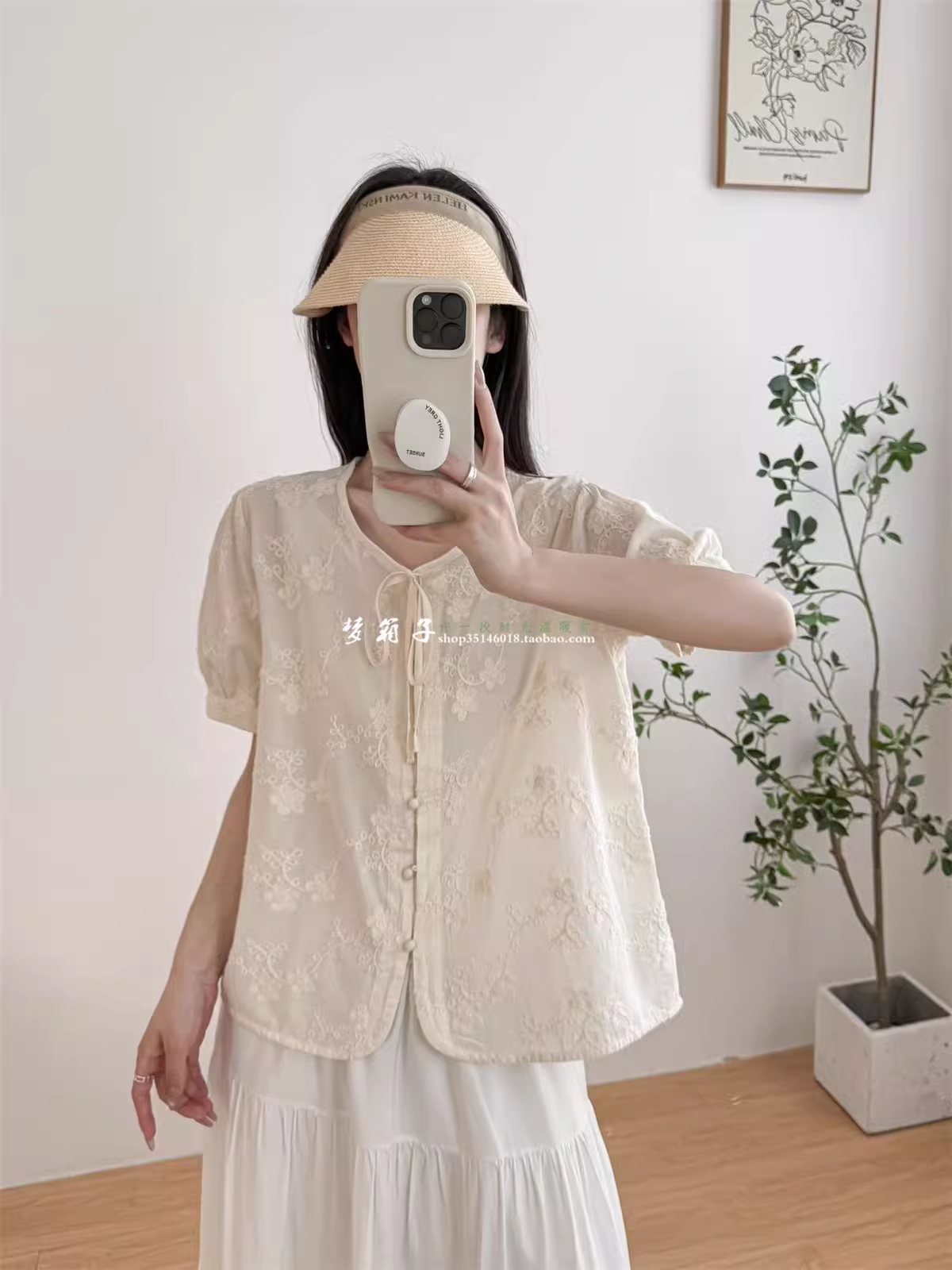 - Áo sơ mi cotton thêu hoa tươi phong cách mới mùa hè 2025 Dream Box, cổ vuông buộc dây, tay ngắn, dáng rộng, trẻ trung