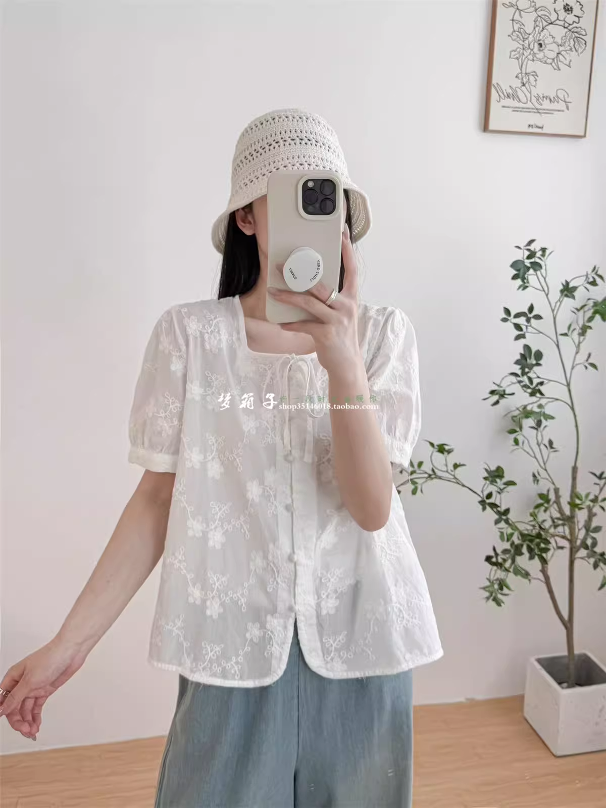 Áo sơ mi cotton thêu hoa tươi phong cách mới mùa hè 2025 Dream Box, cổ vuông buộc dây, tay ngắn, dáng rộng, trẻ trung