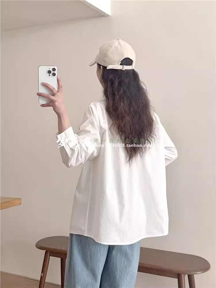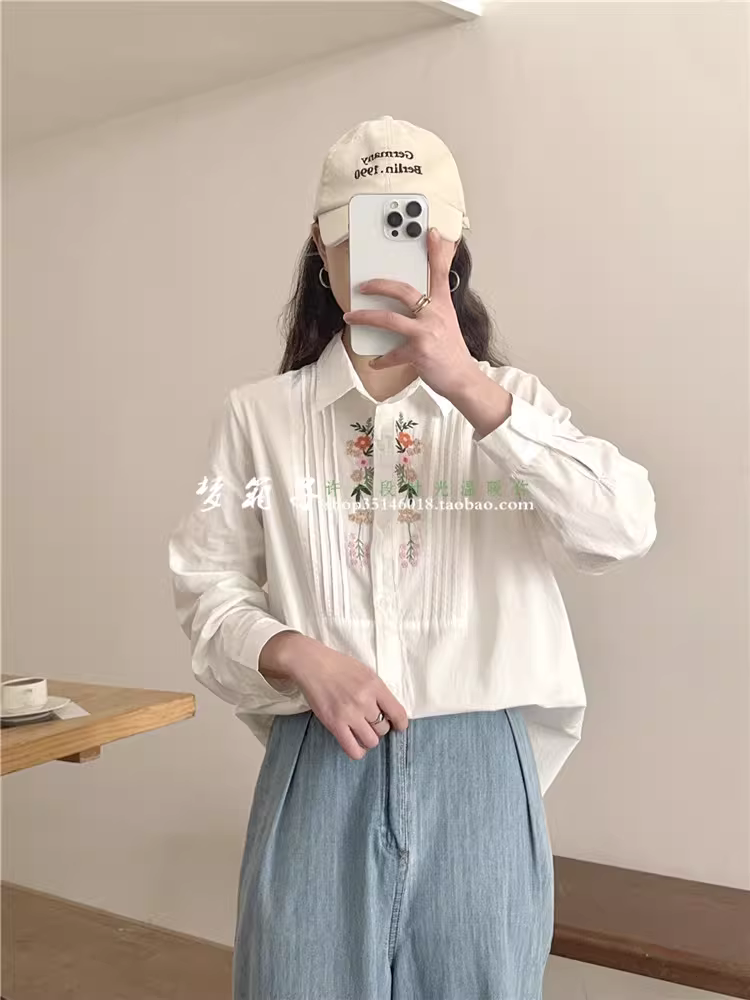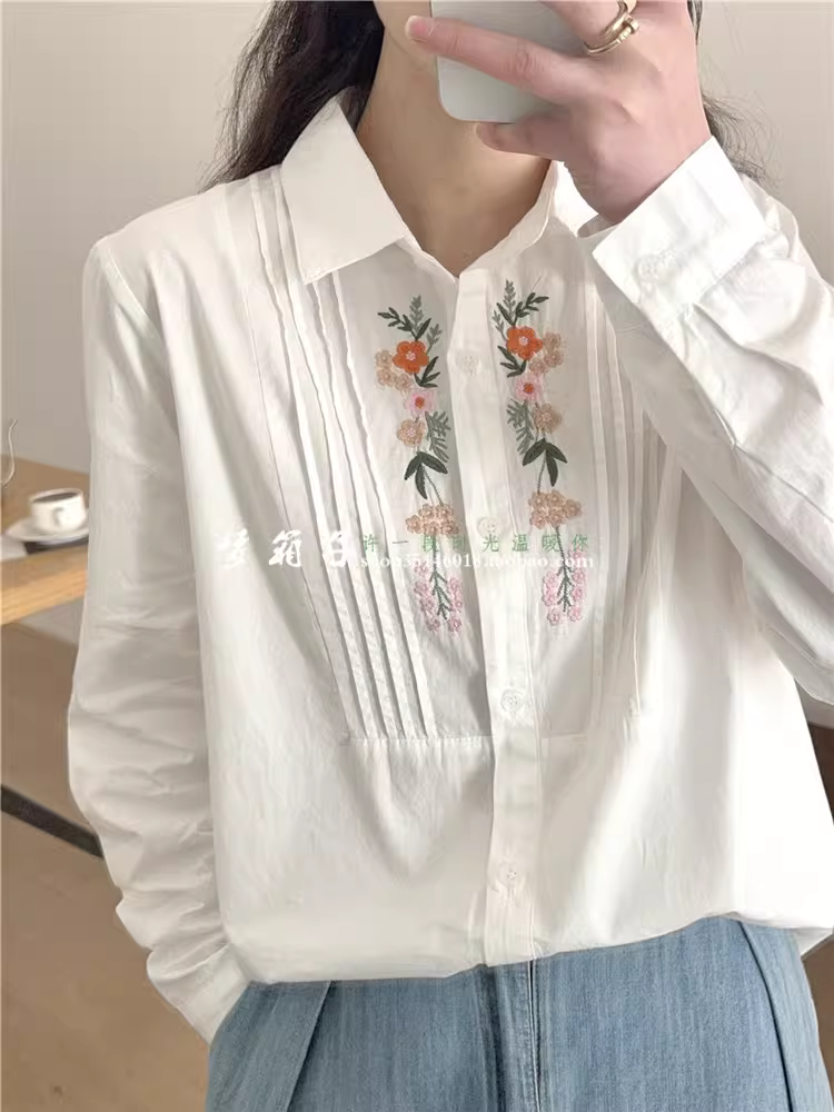 - Áo sơ mi cotton thêu hoa tươi phong cách mới Xuân 2025 Dream Box, cổ trụ, tay dài, xếp ly xếp nếp, dáng rộng, màu trắng.
