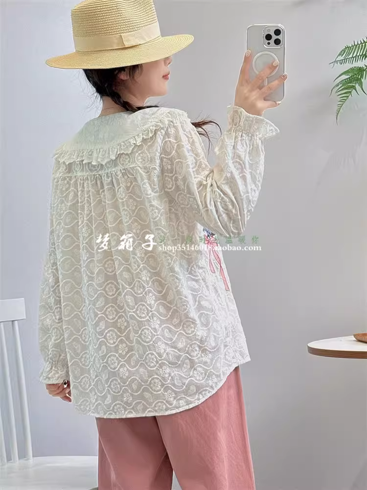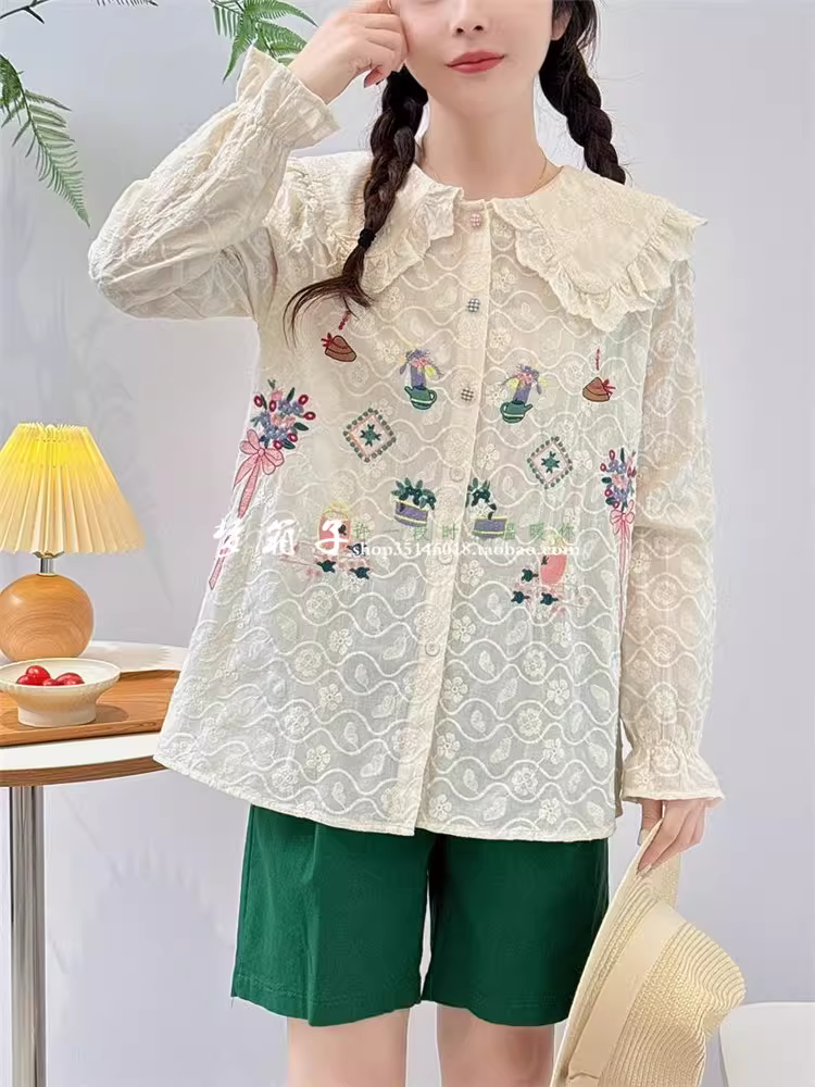 - Áo sơ mi cotton thêu nhiều họa tiết hoạt hình Dream Box 2025 Xuân mới, cổ búp bê, tay dài bèo nhún, dáng rộng