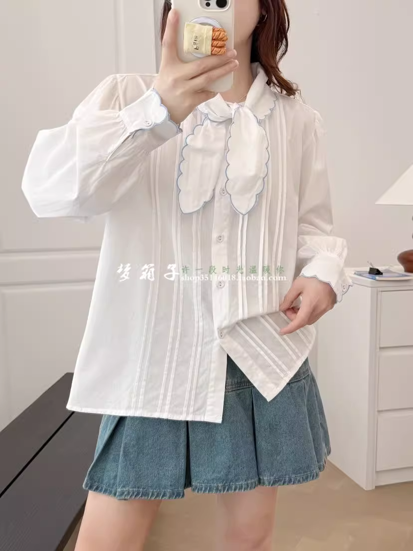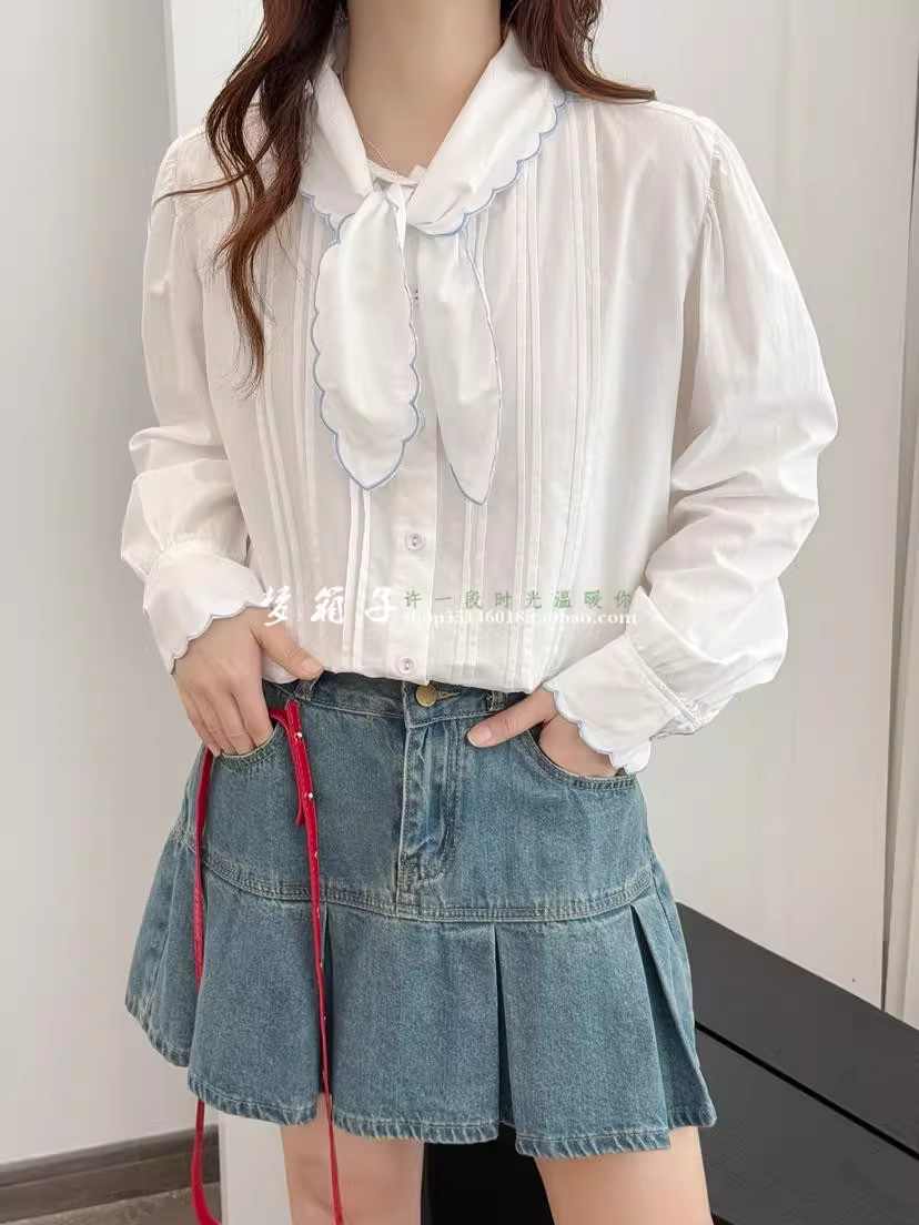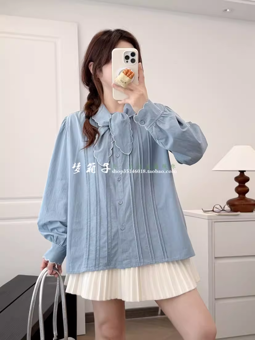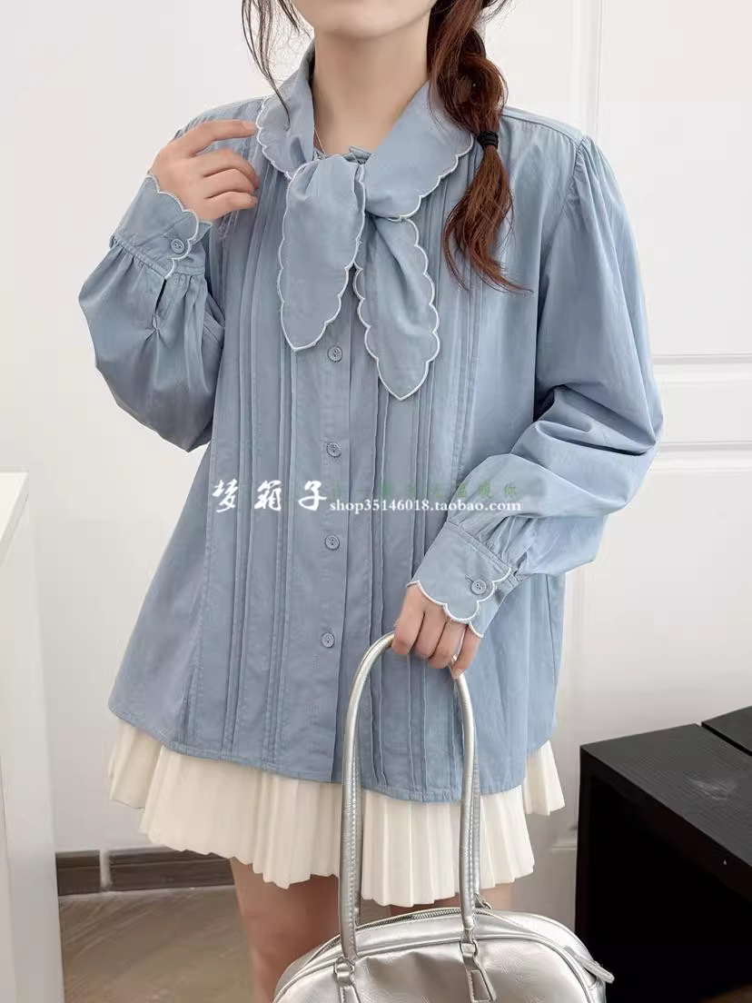 - Áo sơ mi cotton xếp ly dáng rộng, cổ buộc dây chéo, tay dài, kiểu dáng trẻ trung, Dream Box 2025 Thu Mới.