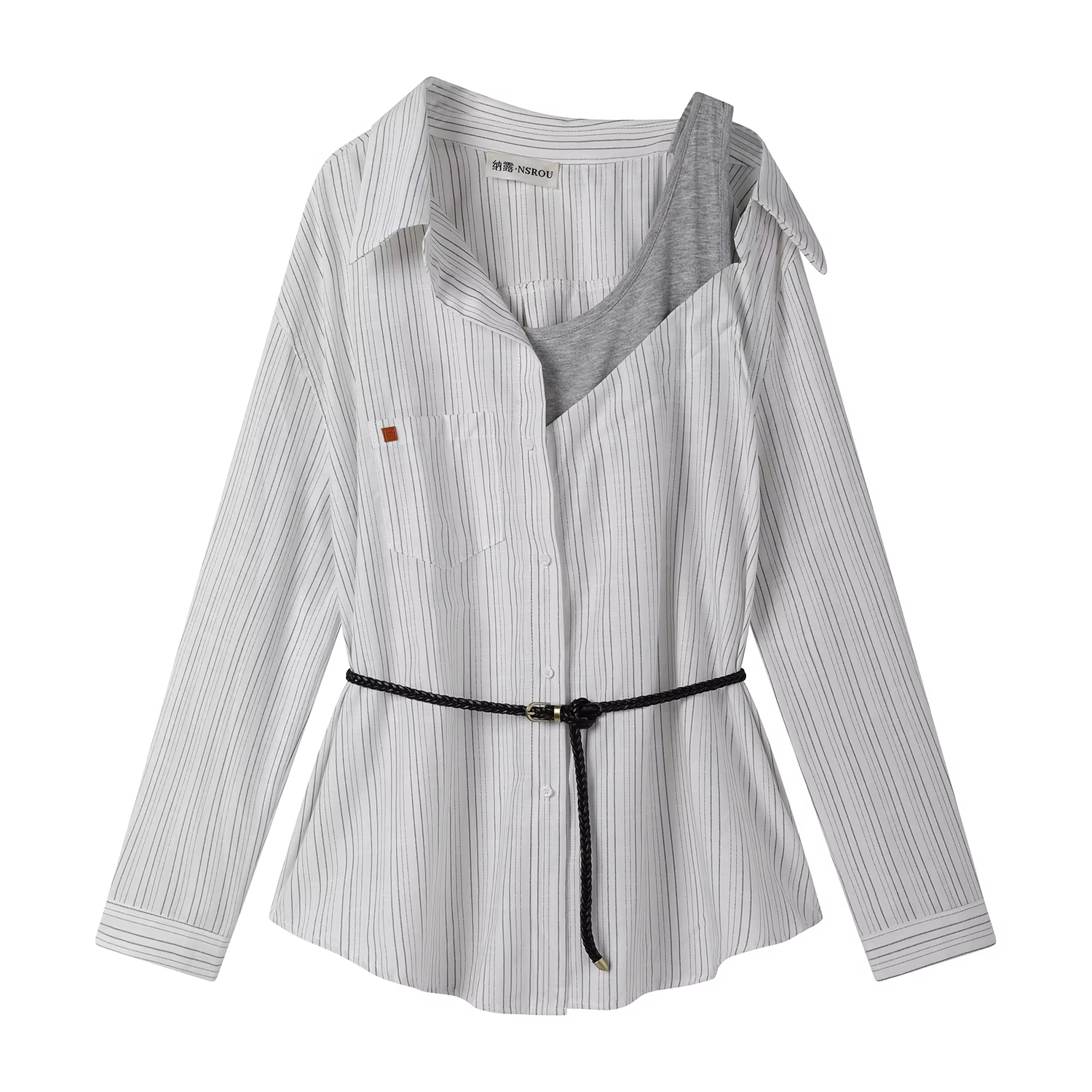Áo sơ mi dài tay lệch vai giả hai mảnh phong cách retro kiểu Hàn Quốc dành cho nữ, áo trễ vai độc đáo và đẹp mới cho đầu mùa thu