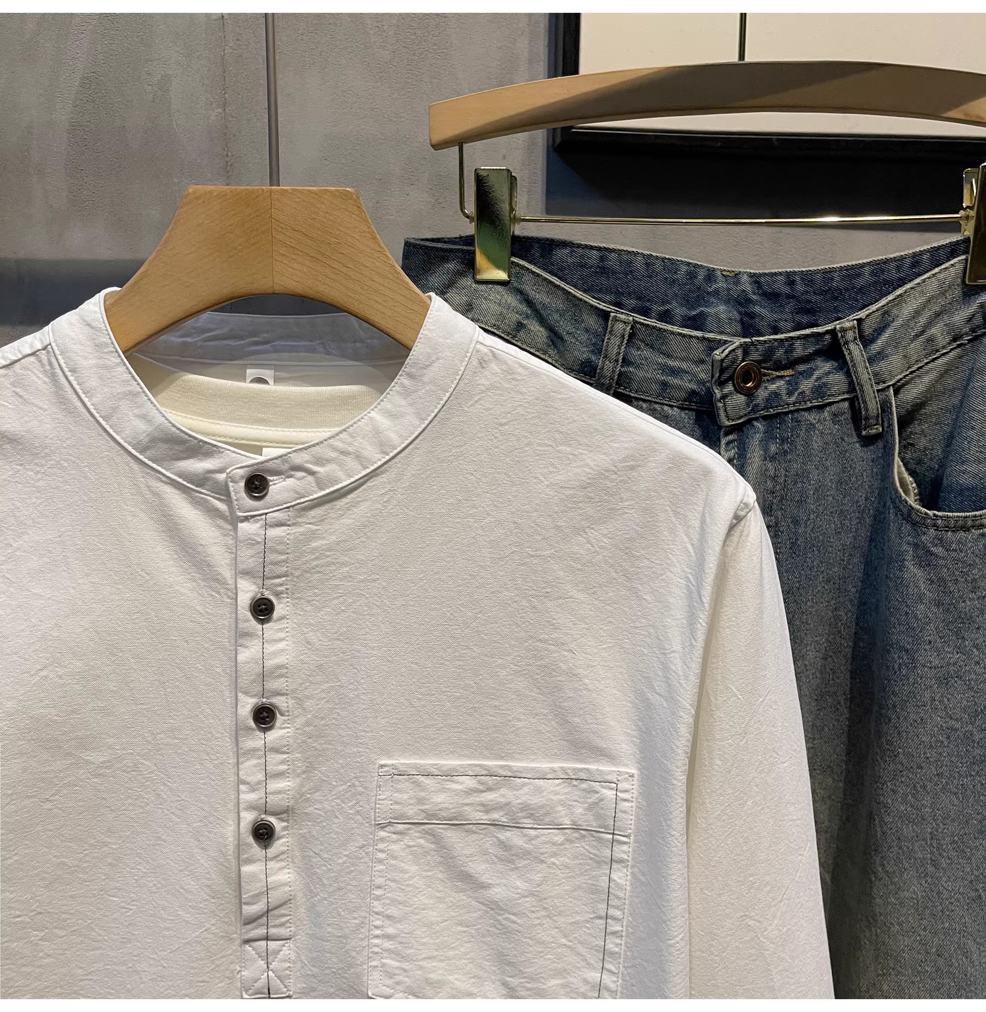 - Áo sơ mi dài tay màu trơn LUUD chất liệu cotton nguyên chất phong cách Nhật Bản cổ Henry mùa thu mới mặc đơn giản thời trang dành cho nam