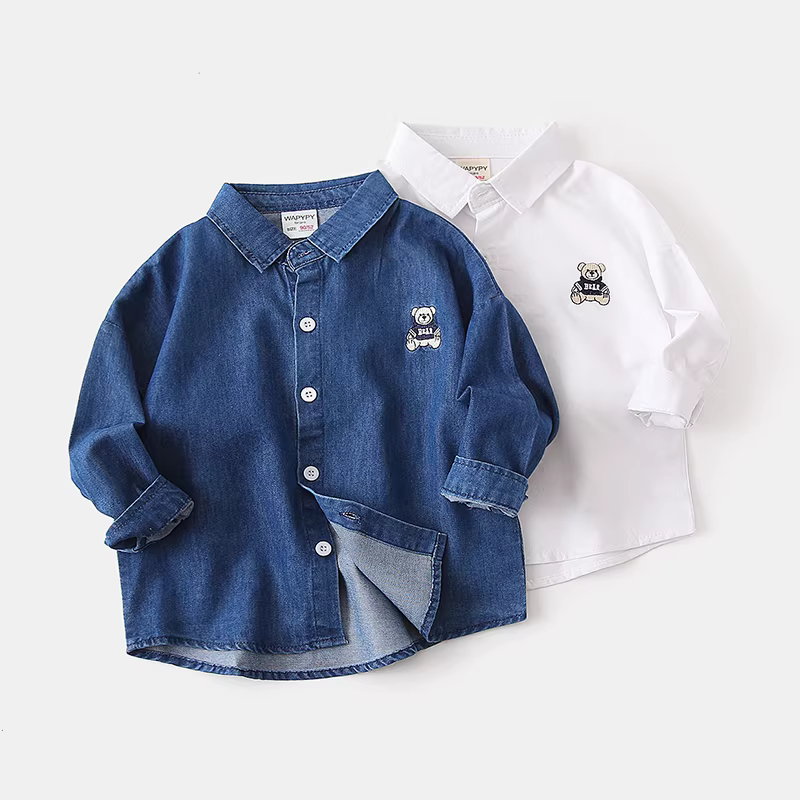 - Áo sơ mi denim bé trai, kiểu xuân thu mới, áo sơ mi dài tay thêu họa tiết thời trang và sành điệu cho bé, áo trẻ em phong cách Hàn Quốc