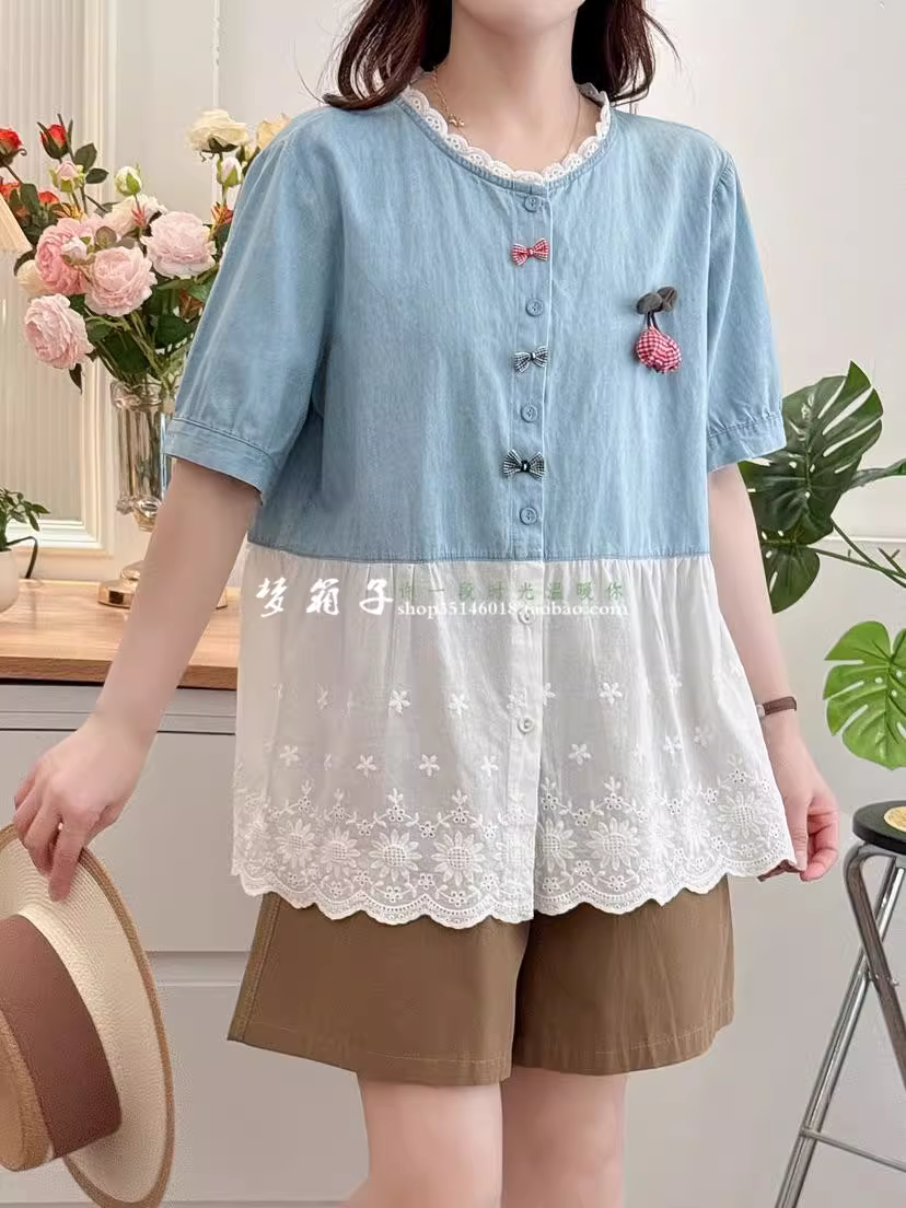 - Áo sơ mi denim cherry ngọt ngào mùa hè 2025 Dream Box, cổ tròn, tay ngắn, dáng rộng, viền ren, trẻ trung