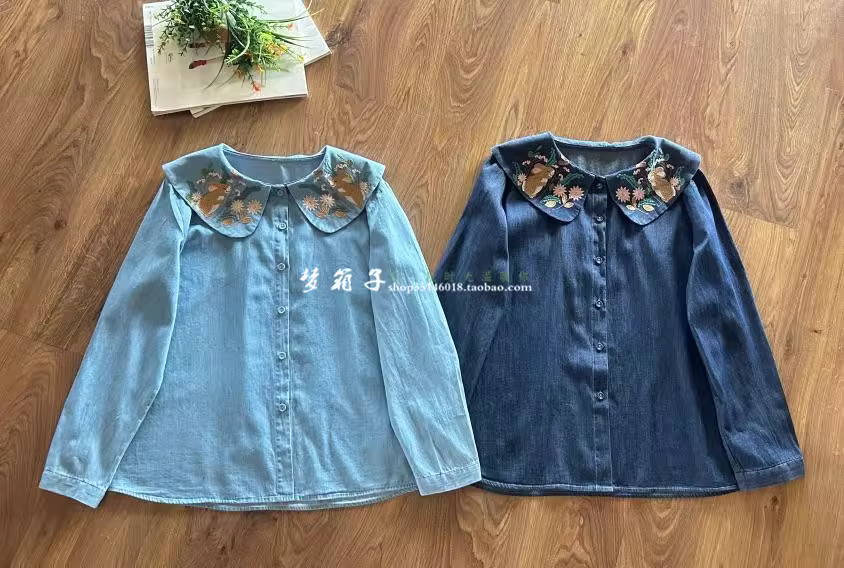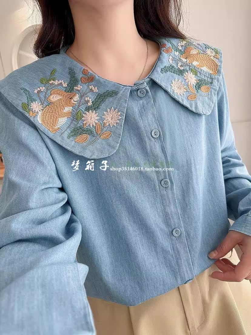 - Áo sơ mi denim dáng rộng tay dài cổ búp bê thêu hoa thỏ mùa thu mới Dream Box 2025 dành cho nữ, giúp trẻ hóa