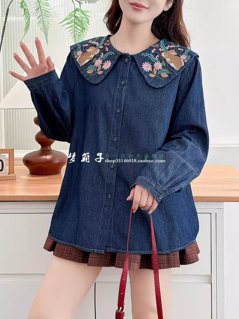 Áo sơ mi denim dáng rộng tay dài cổ búp bê thêu hoa thỏ mùa thu mới Dream Box 2025 dành cho nữ, giúp trẻ hóa