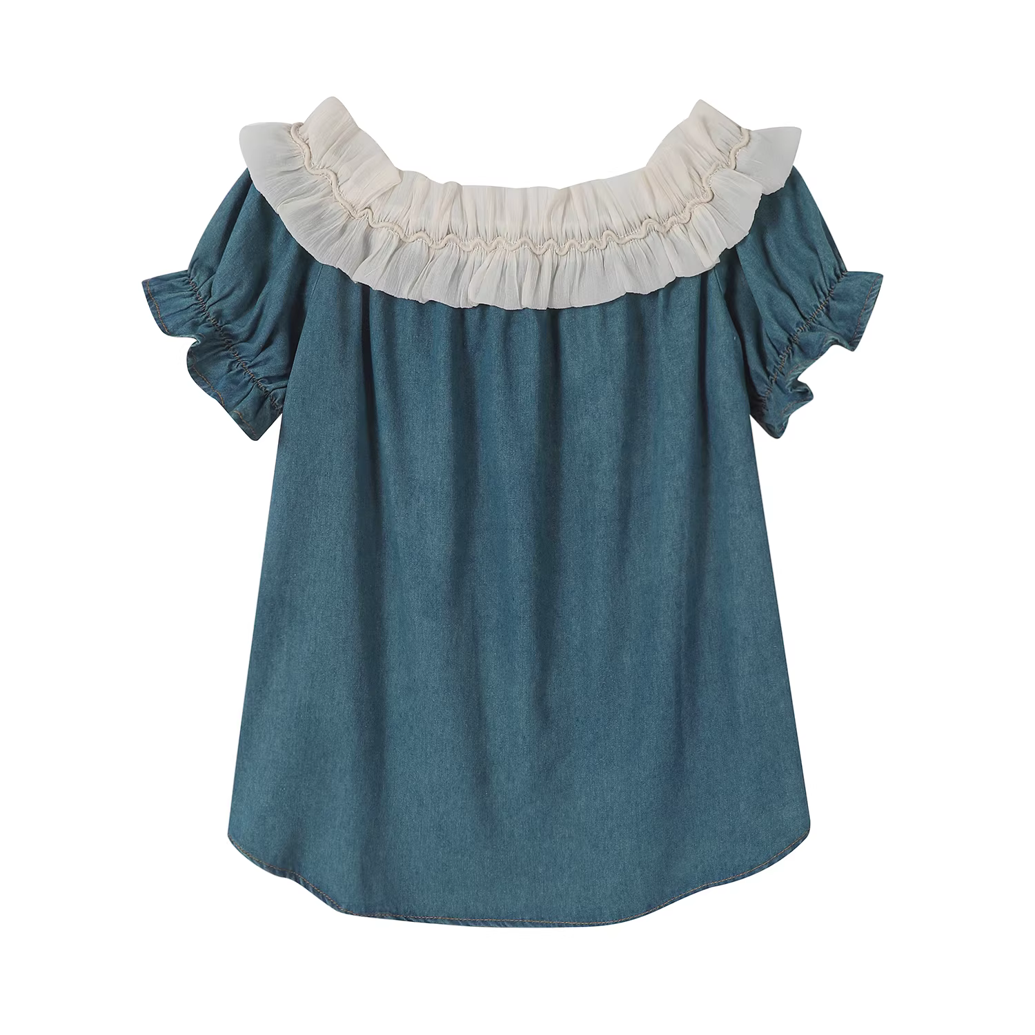 Áo sơ mi denim ngắn tay ren xếp nếp phong cách Pháp dễ thương dành cho nữ, áo trễ vai tay phồng mùa hè