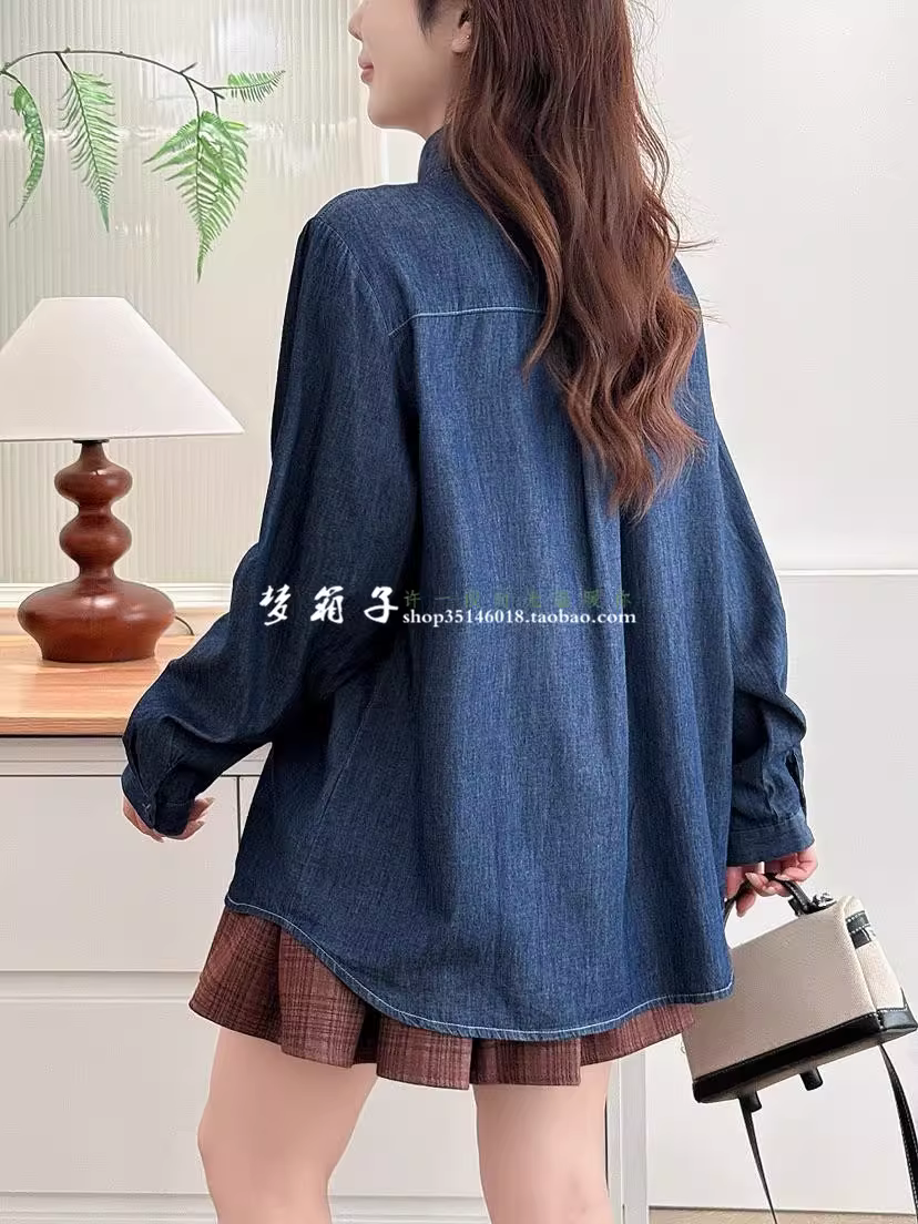 Áo sơ mi denim thêu hình cáo nhỏ Dream Box 2025 Thu mới, cổ trụ, tay dài, vạt áo xếp ly, dáng rộng.