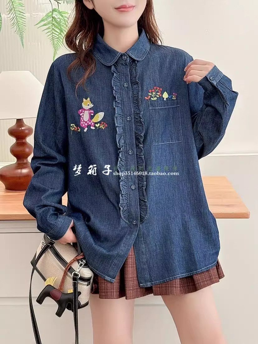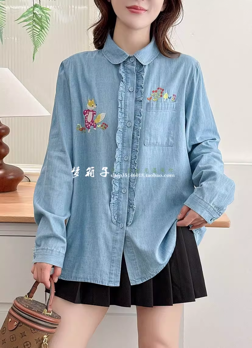 - Áo sơ mi denim thêu hình cáo nhỏ Dream Box 2025 Thu mới, cổ trụ, tay dài, vạt áo xếp ly, dáng rộng.