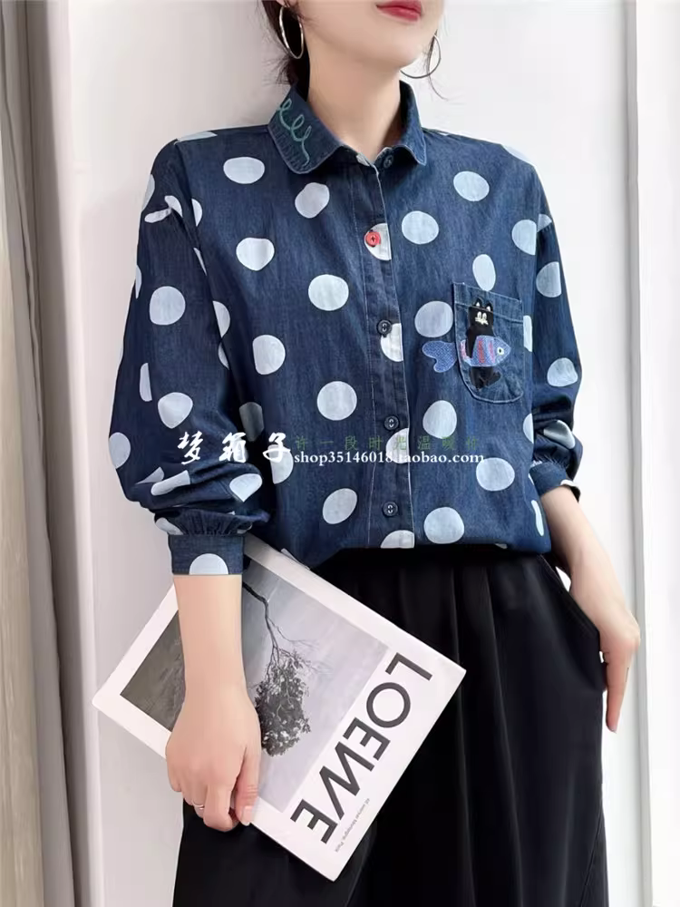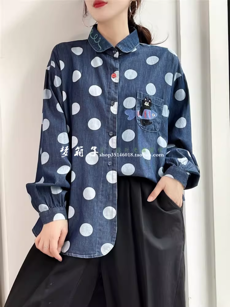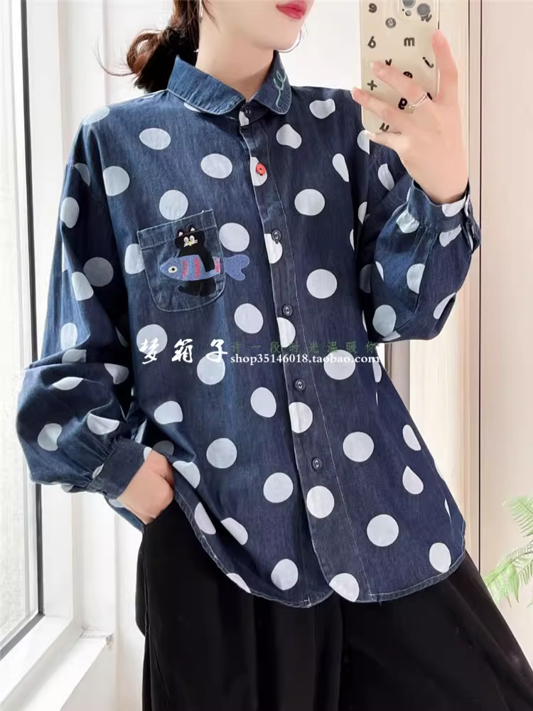 - Áo sơ mi denim thêu hình mèo câu cá mùa thu mới Dream Box 2024, cổ trụ, tay dài, dáng rộng, họa tiết chấm bi lớn