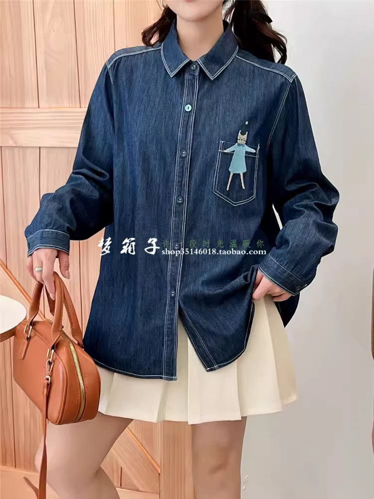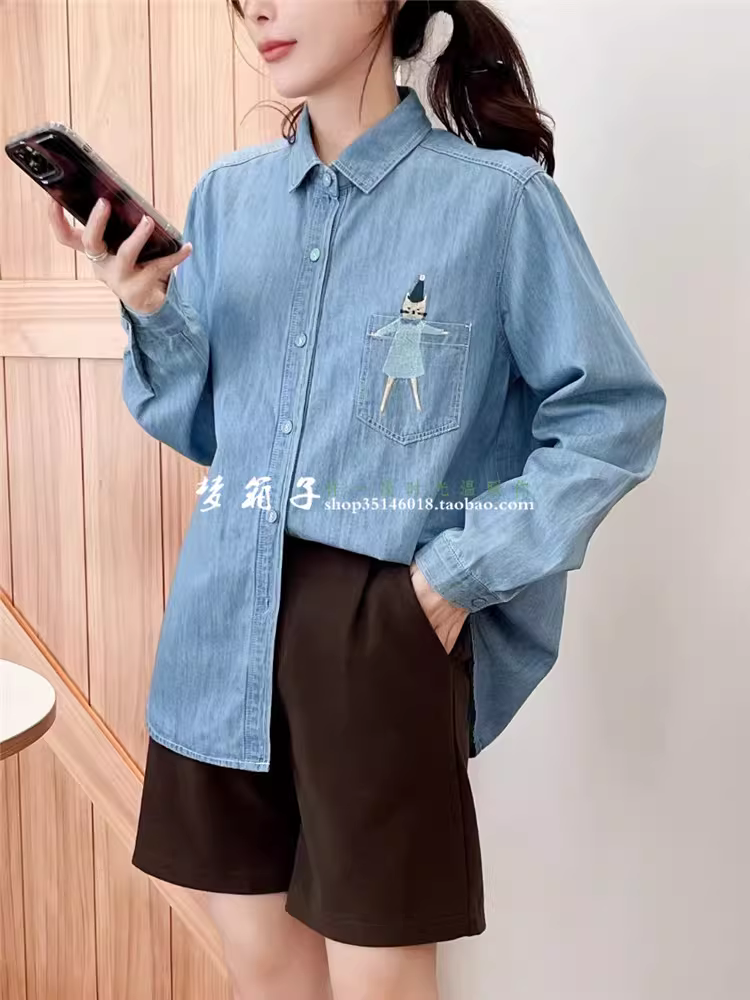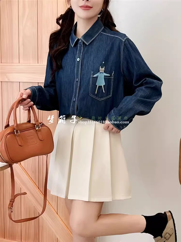 Áo sơ mi denim thêu hình mèo nữ tính Dream Box Thu 2024, cổ trụ, tay dài, dáng rộng, phong cách thường ngày