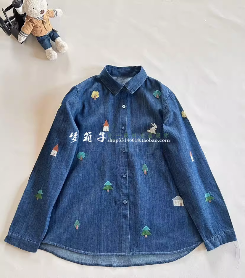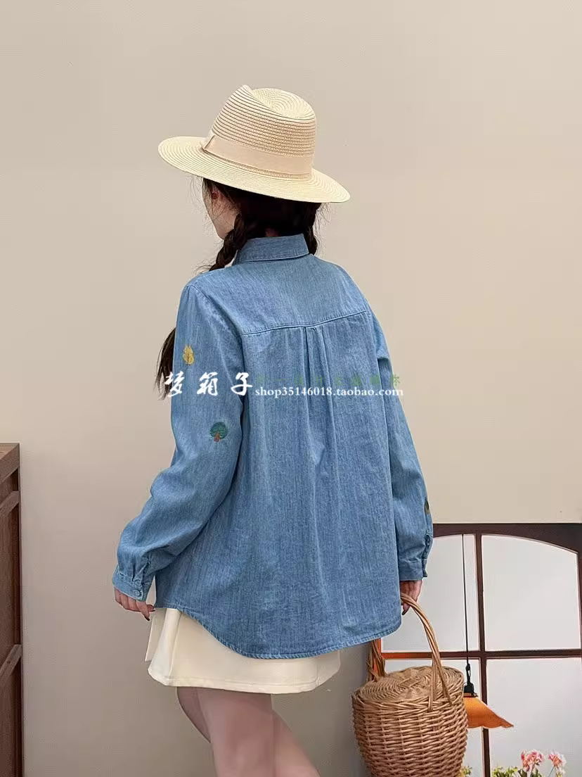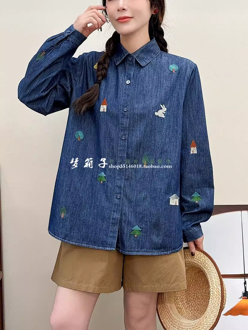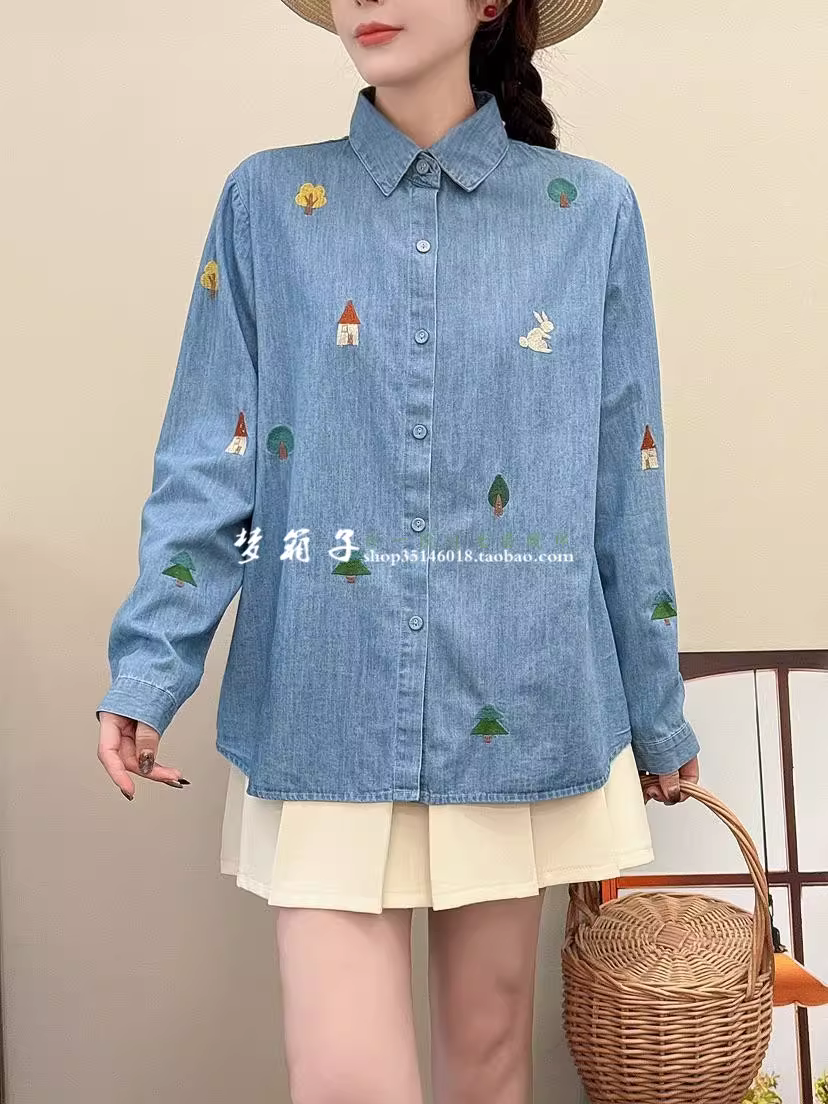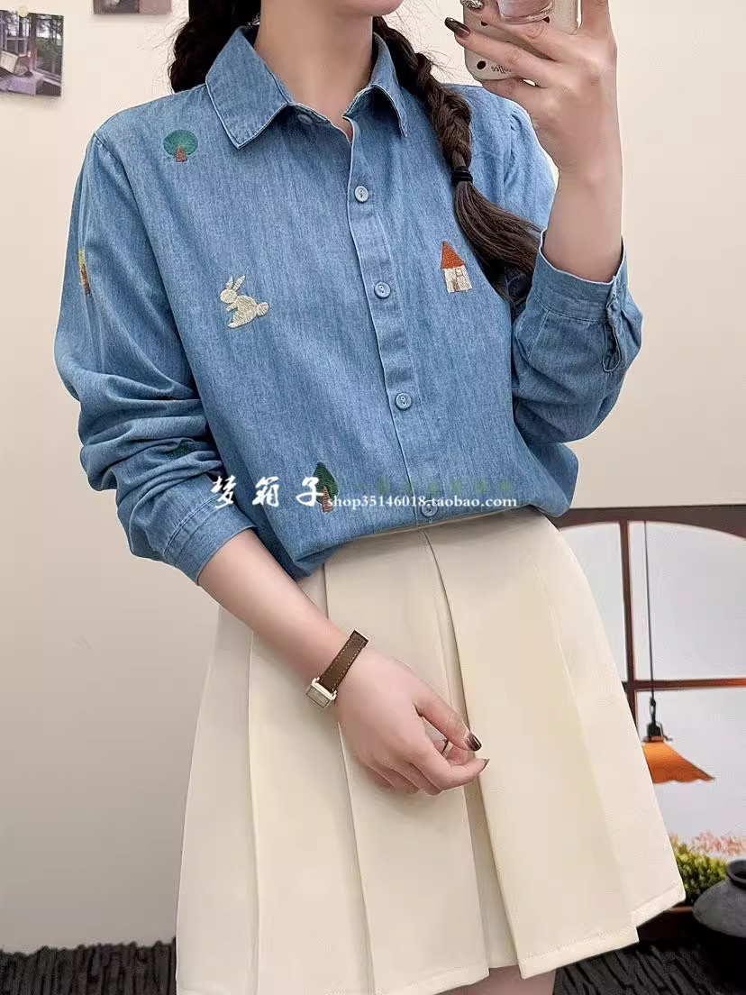 Áo sơ mi denim thêu hình nhà và cây phong cách mới mùa xuân 2025 của Dream Box, cổ sơ mi, tay dài, dáng rộng, áo thêu hình thỏ.