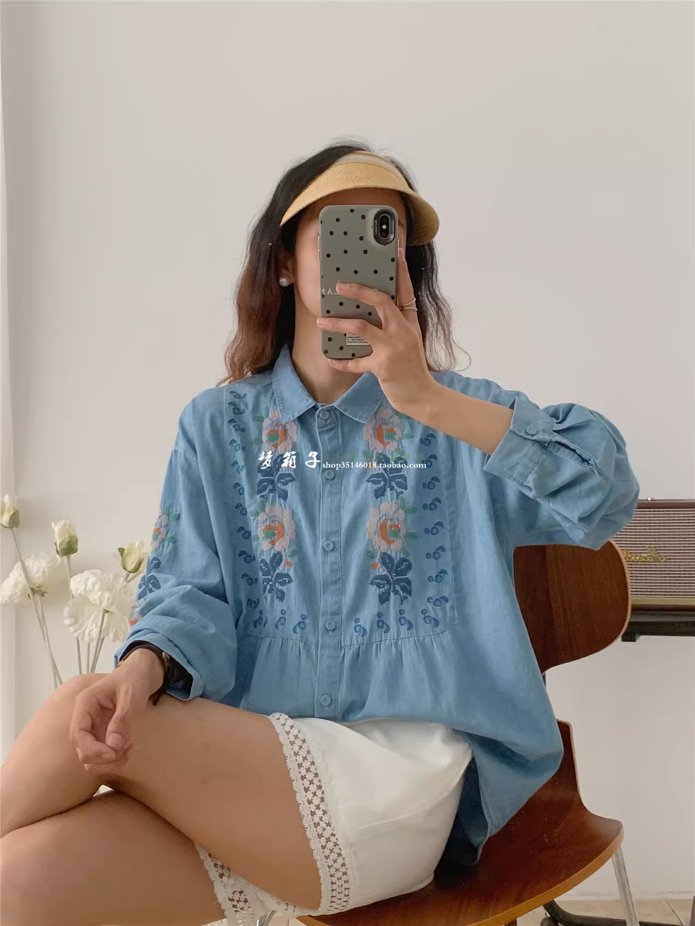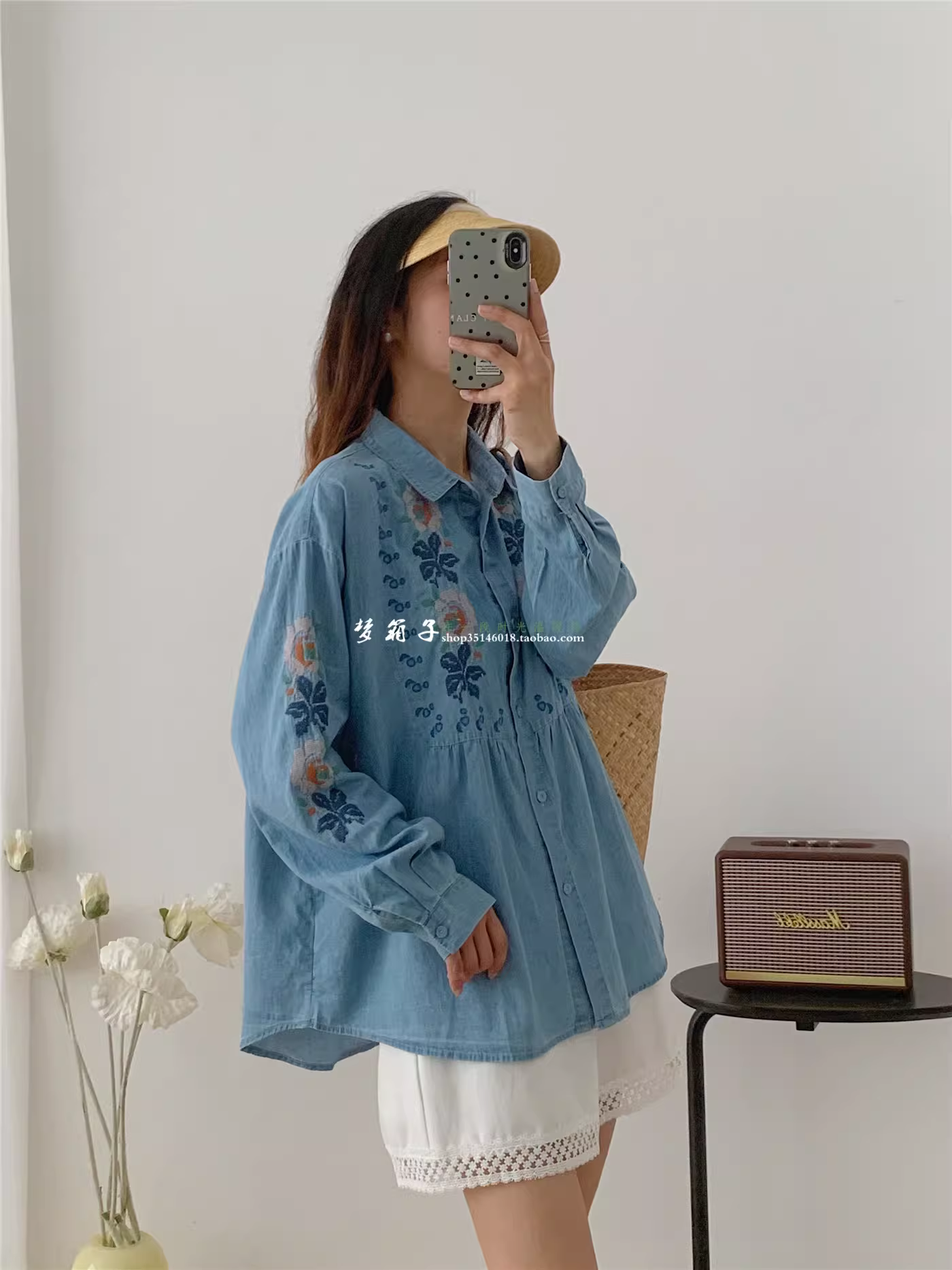 - Áo sơ mi denim thêu hoa cổ điển mùa thu Dream Box 2025, cổ trụ, tay áo dài, dáng rộng, kiểu áo trẻ trung.