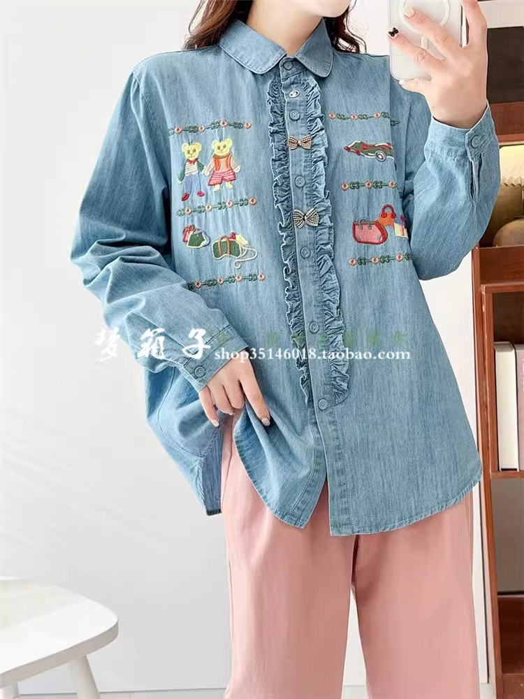- Áo sơ mi denim thêu hoạt hình Dream Box 2025 Xuân mới, cổ trụ, tay dài, vạt áo xếp ly, dáng rộng, dành cho nữ