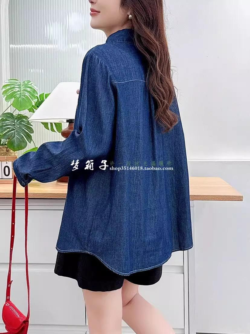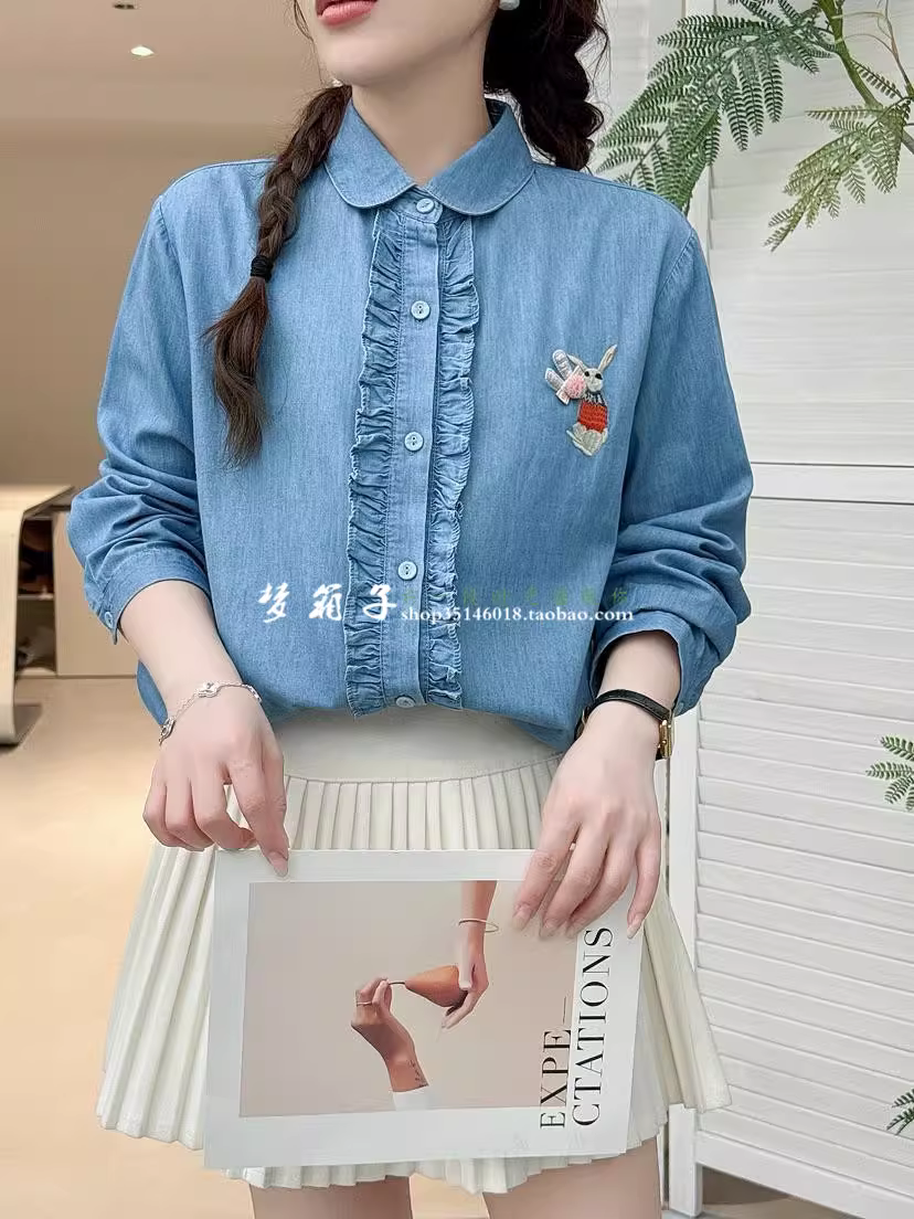 - Áo sơ mi denim thêu thỏ mùa thu Dream Box 2025, cổ trụ, tay dài, vạt áo xếp ly, dáng rộng, dành cho nữ.