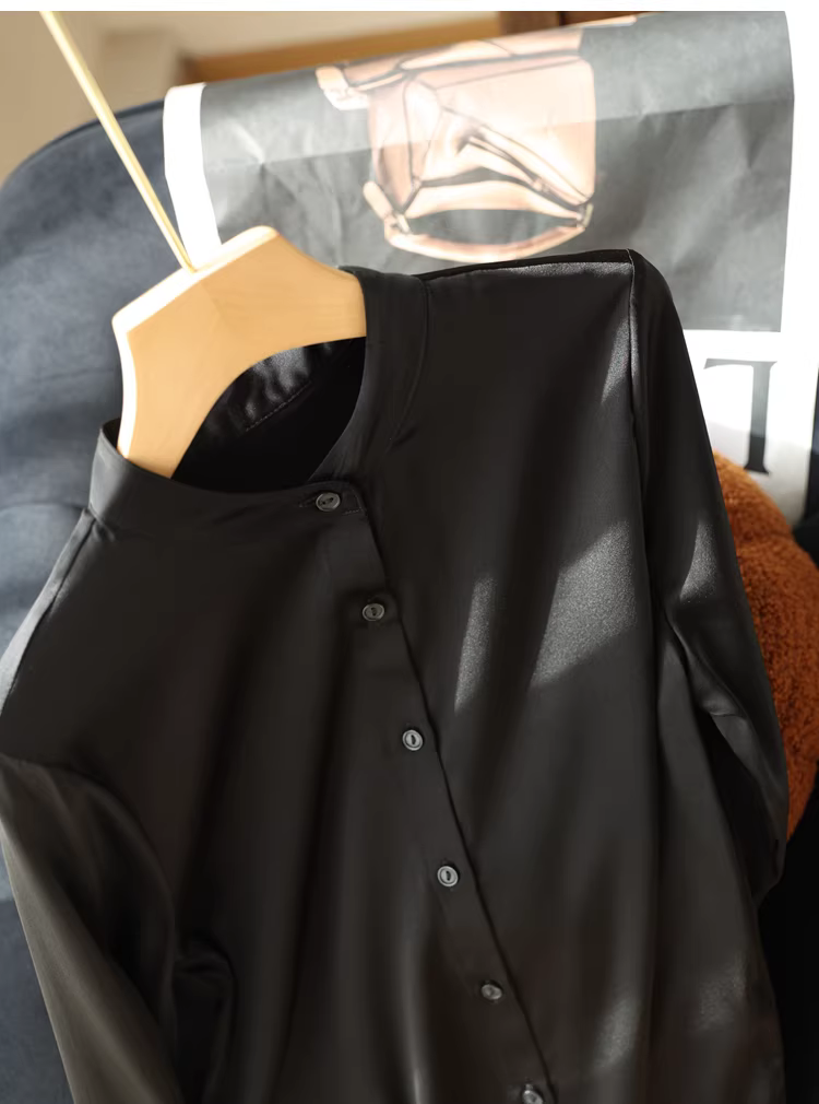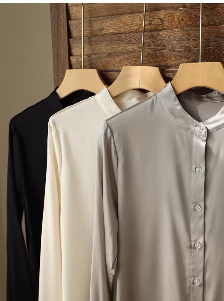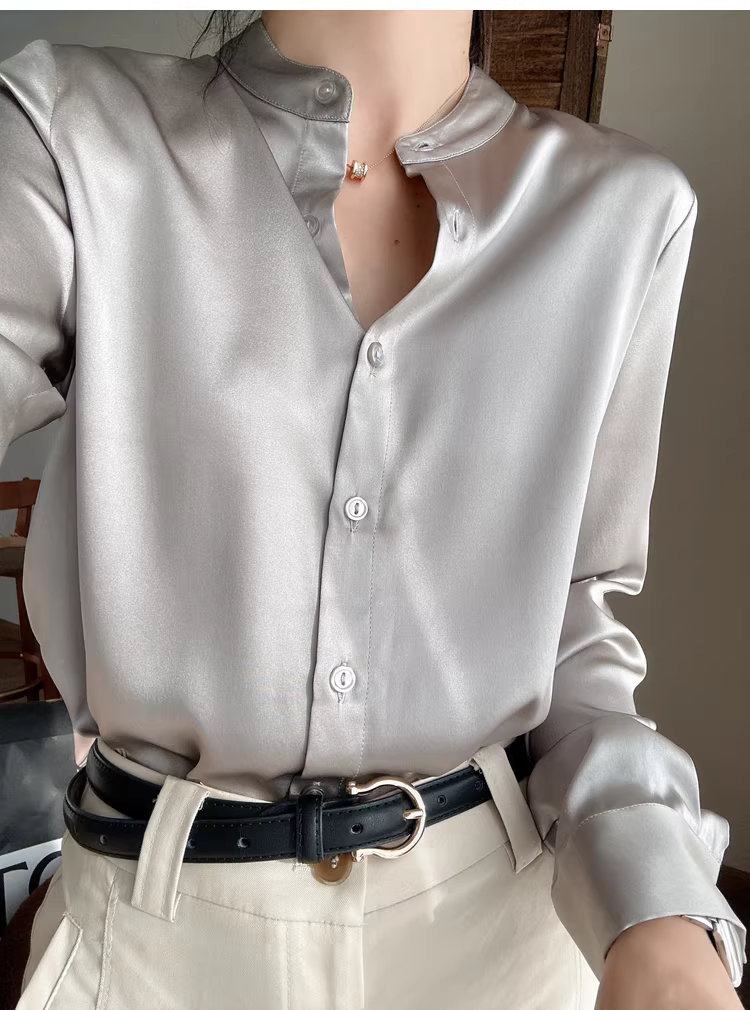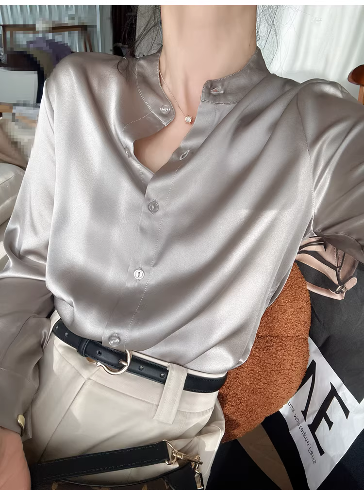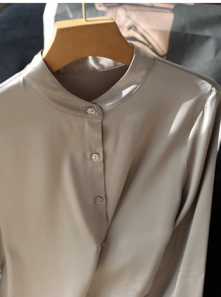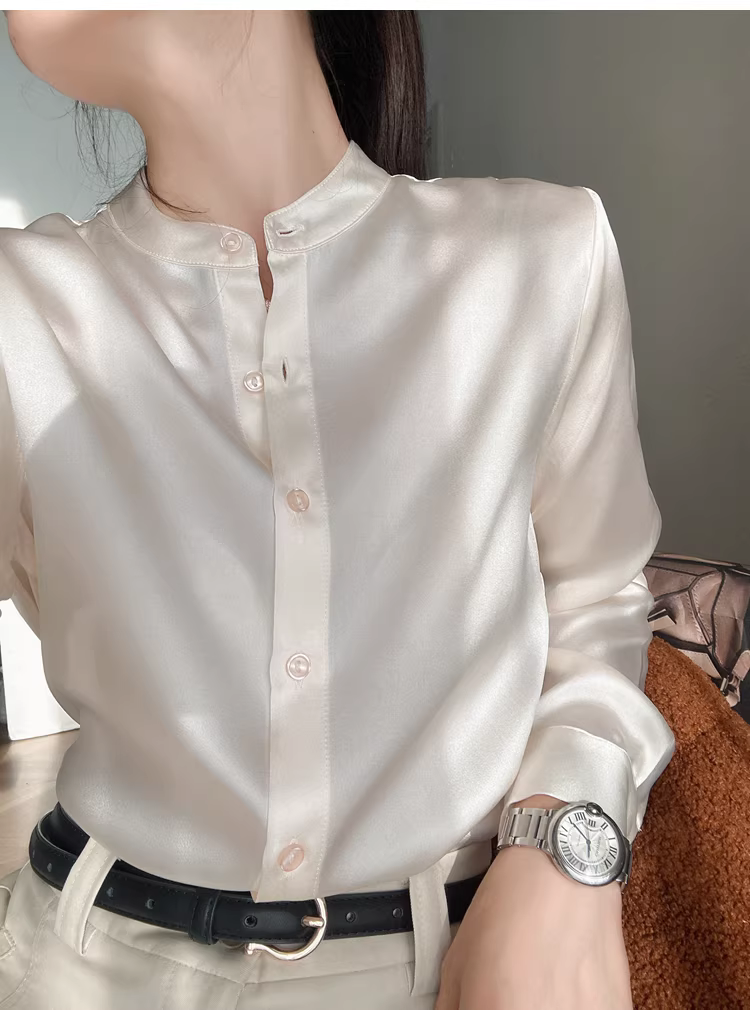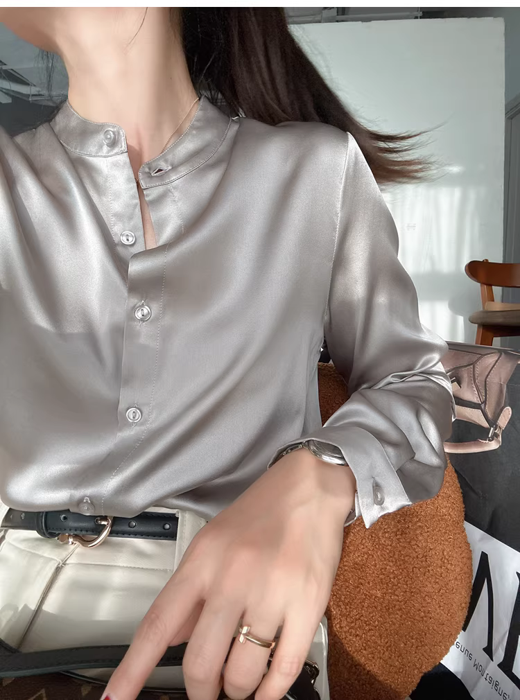 Áo sơ mi lụa nặng 19mm, chất liệu lụa tơ tằm bóng mượt cao cấp, kiểu cổ đứng, màu trơn, dành cho nữ mùa thu.