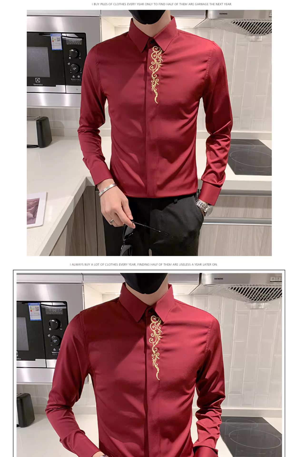 Áo sơ mi nam cao cấp tay dài, kiểu dáng ôm body mới, thích hợp cho công sở và thường ngày mùa xuân thu, màu đỏ với khuy giấu và thêu theo năm sinh.