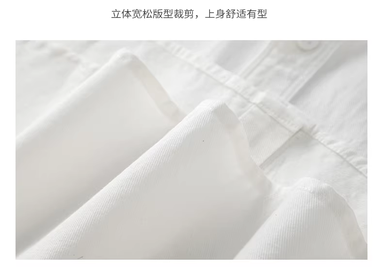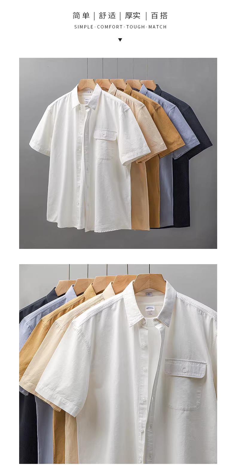 Áo sơ mi nam chất liệu cotton dày dặn, tay ngắn, kiểu dáng rộng rãi mùa hè, túi cổ điển, cổ áo sơ mi, màu trắng.