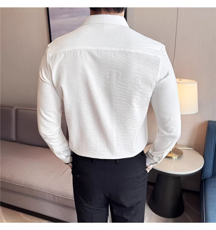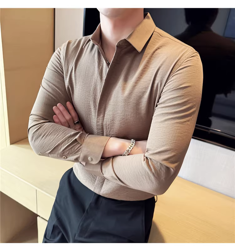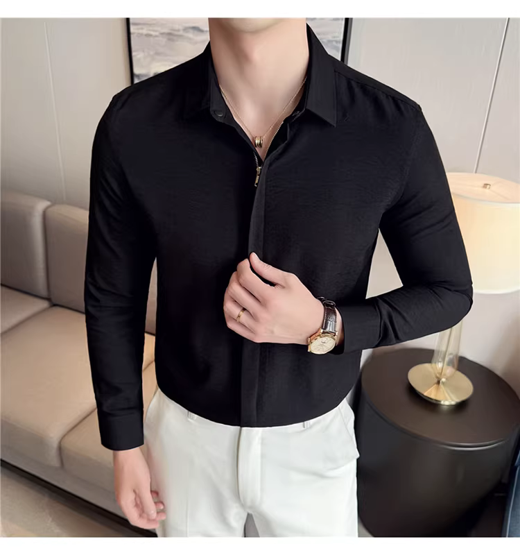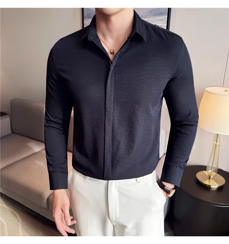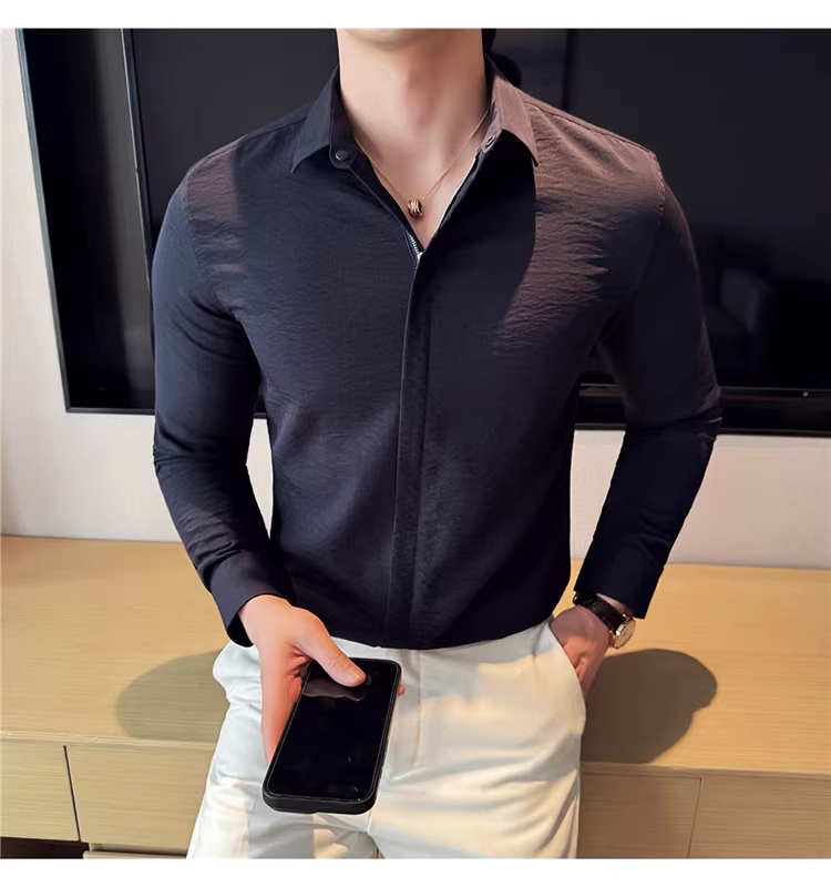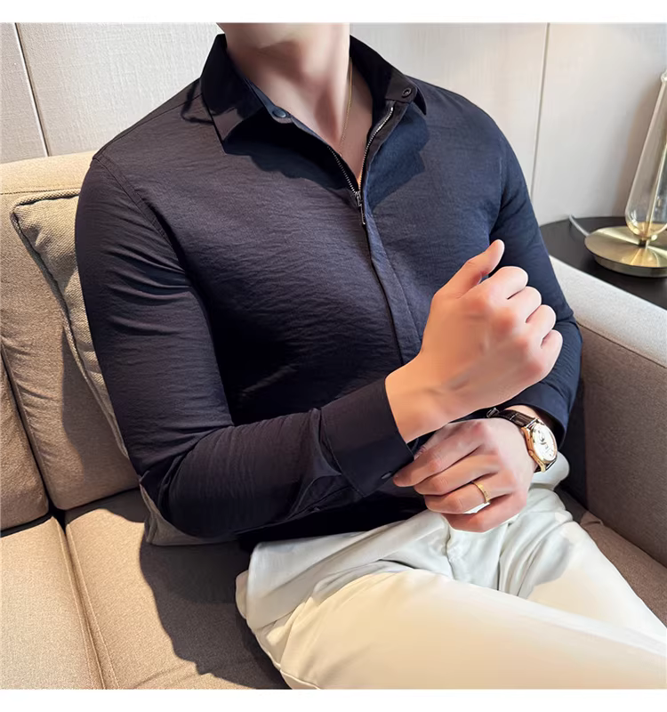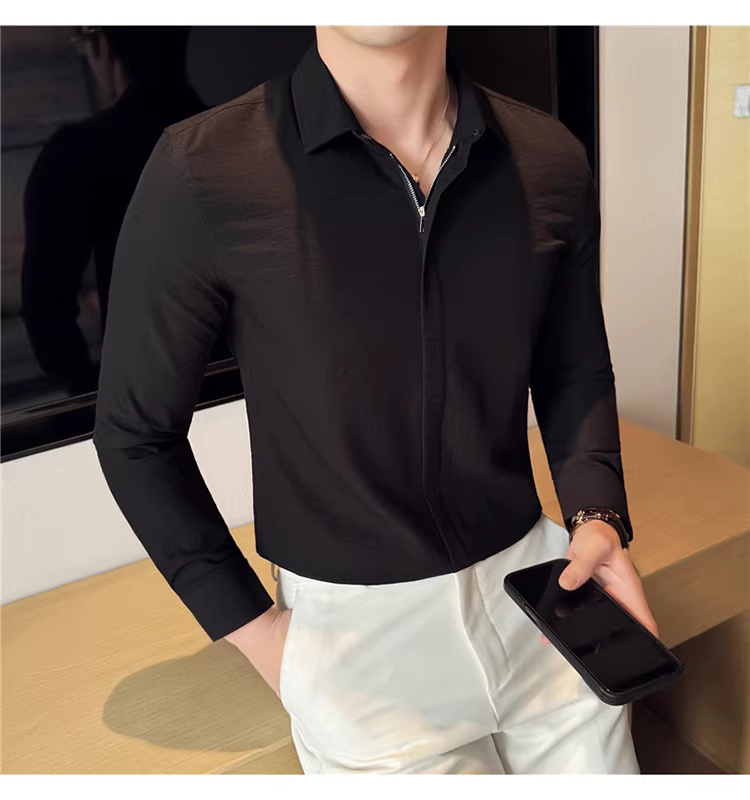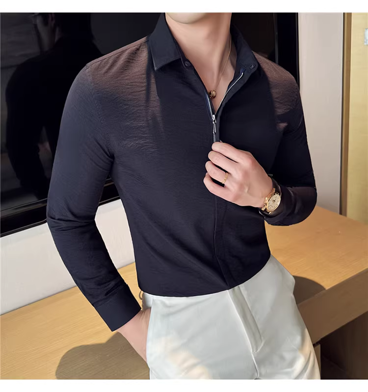 - Áo sơ mi nam chất liệu cotton và lanh, thiết kế khóa kéo mỏng, tay dài, phong cách công sở lịch lãm, đa năng, co giãn và thoải mái.
