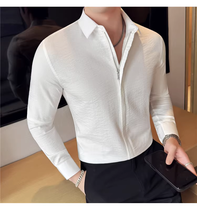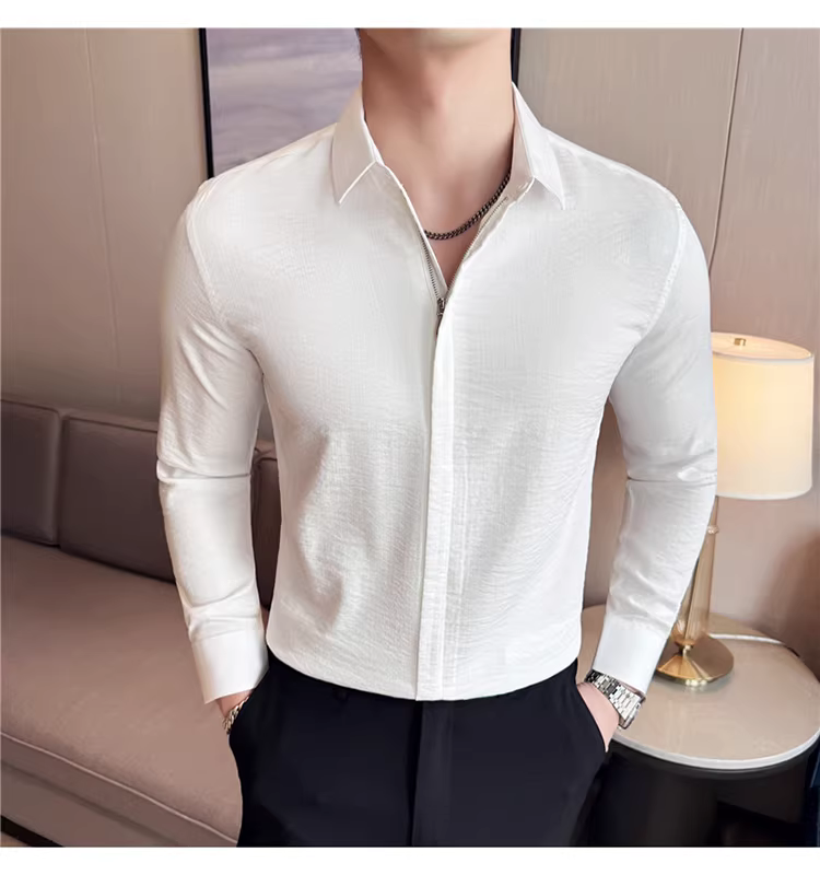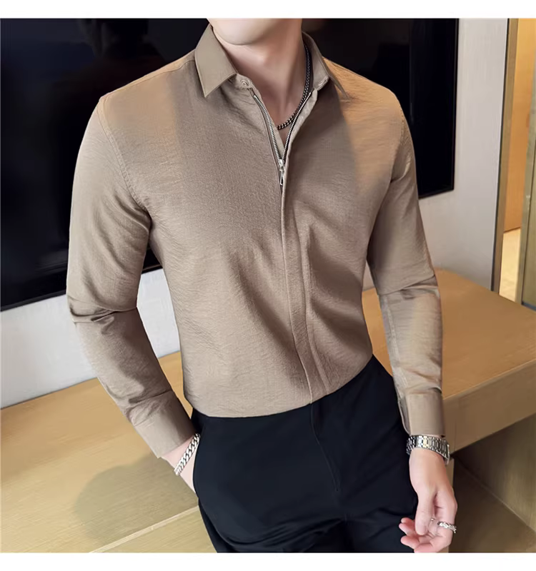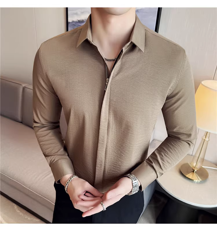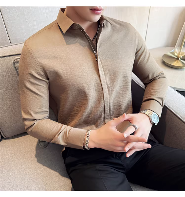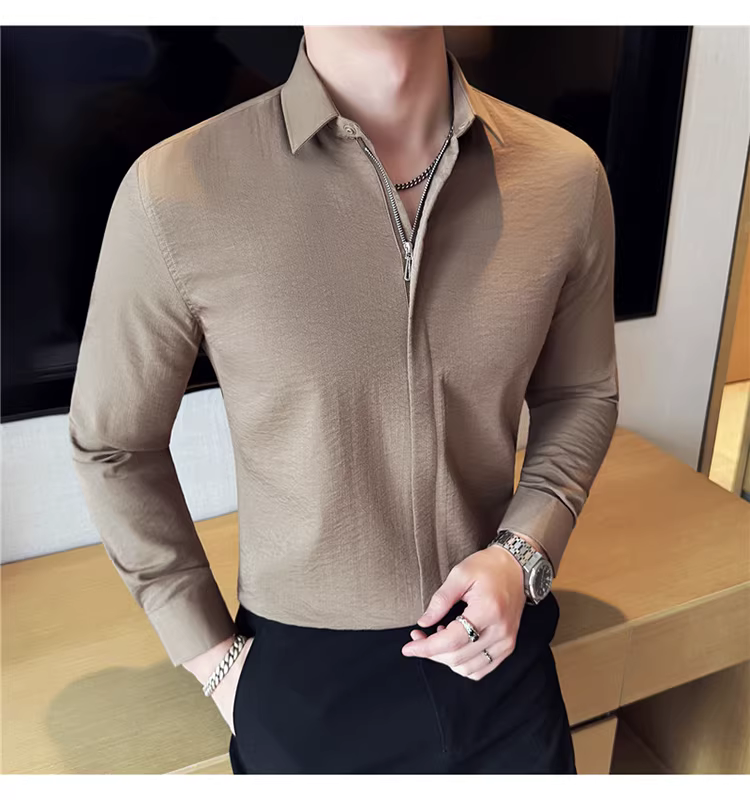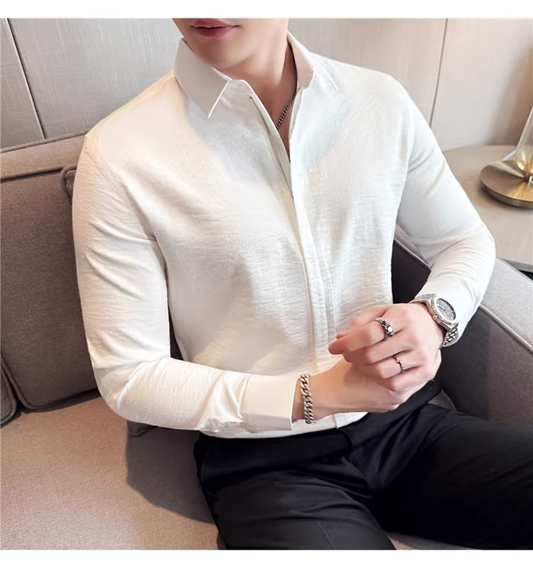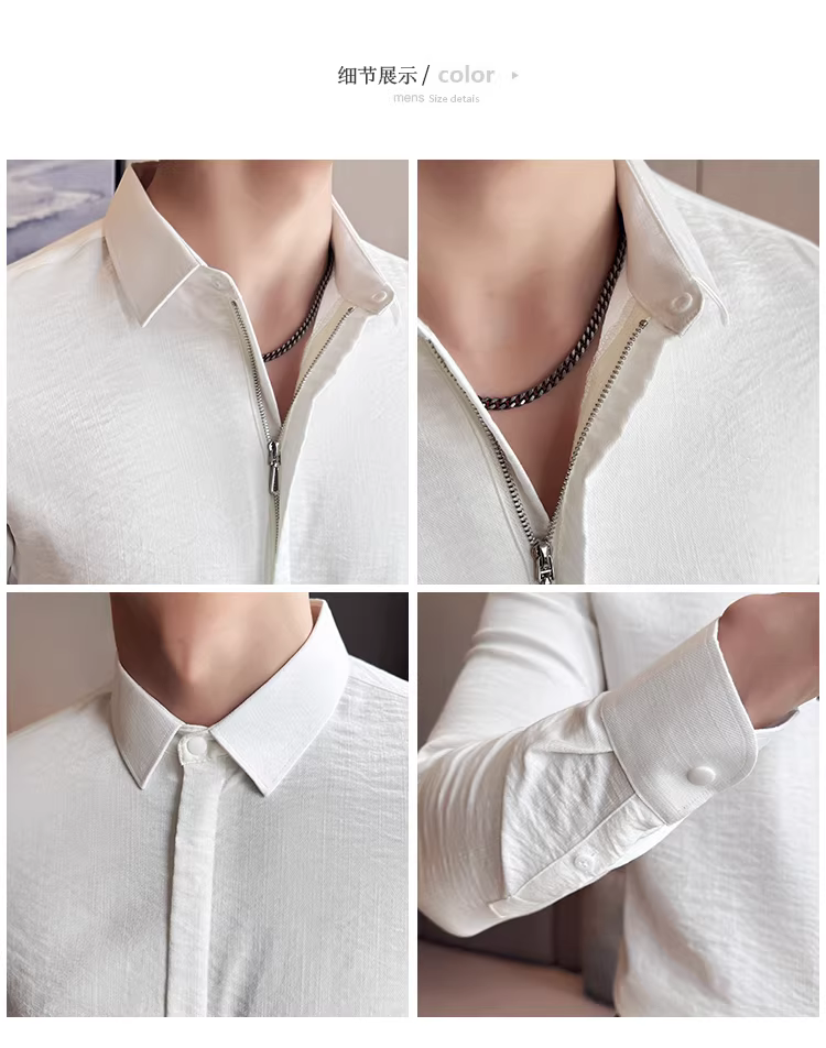 Áo sơ mi nam chất liệu cotton và lanh, thiết kế khóa kéo mỏng, tay dài, phong cách công sở lịch lãm, đa năng, co giãn và thoải mái.