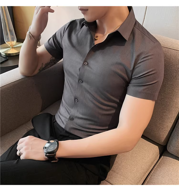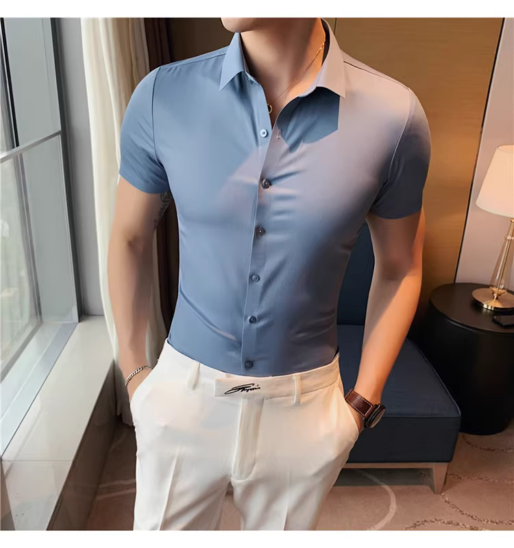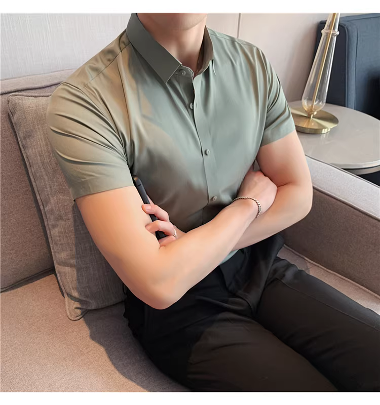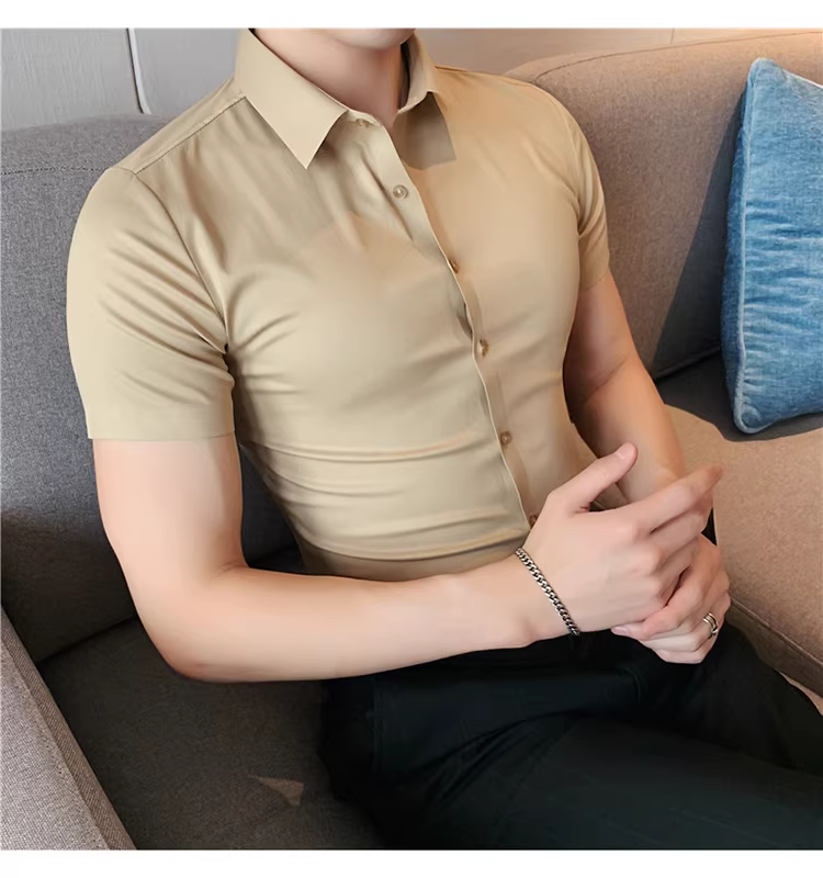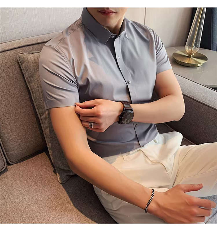 Áo sơ mi nam chất liệu lụa đá, không đường may, tay ngắn, kiểu mới hè 2025, chất liệu mềm mại, phong cách lịch sự nhưng năng động, không nhăn, dễ chăm sóc, không cần là ủi.