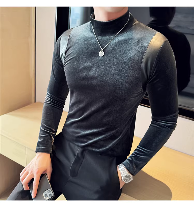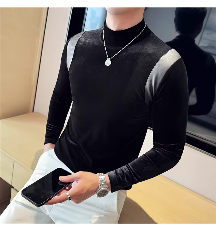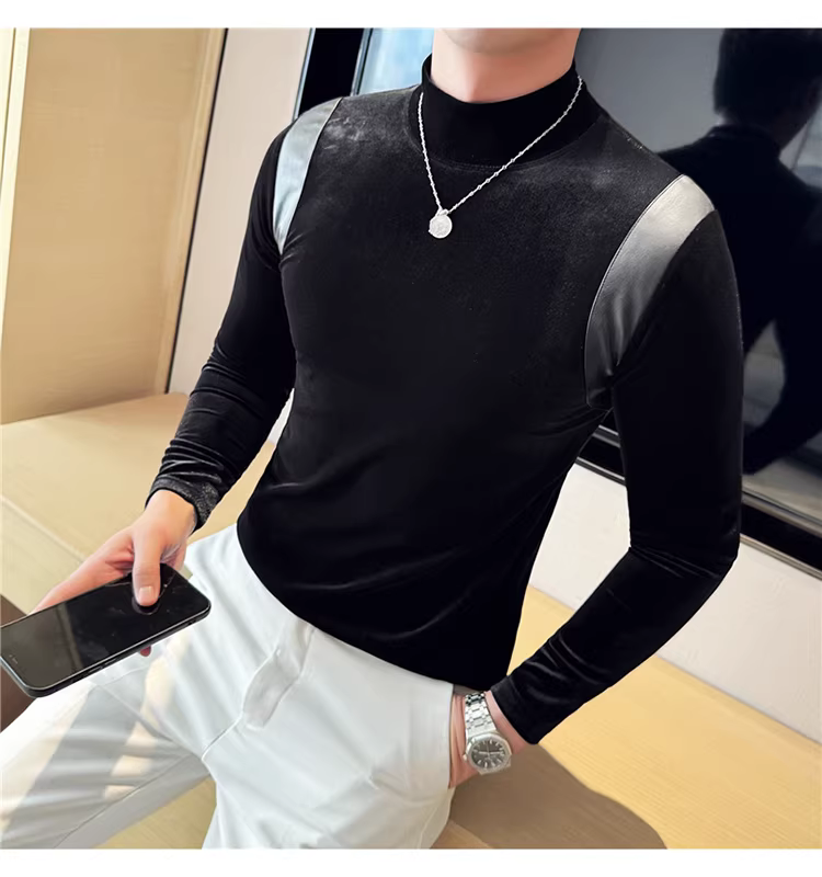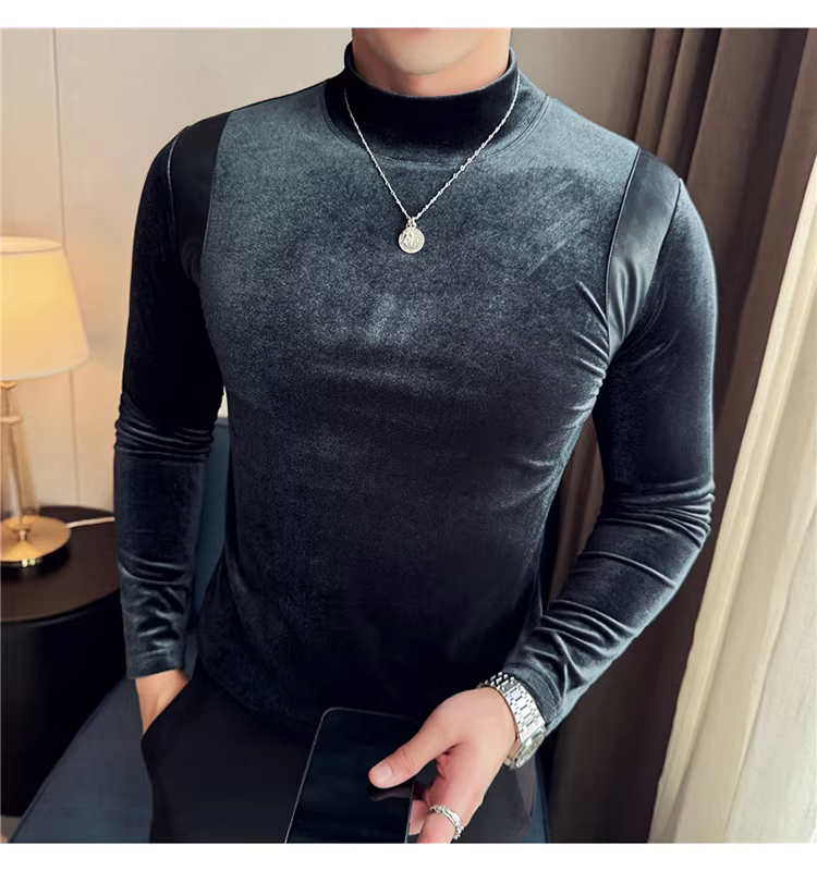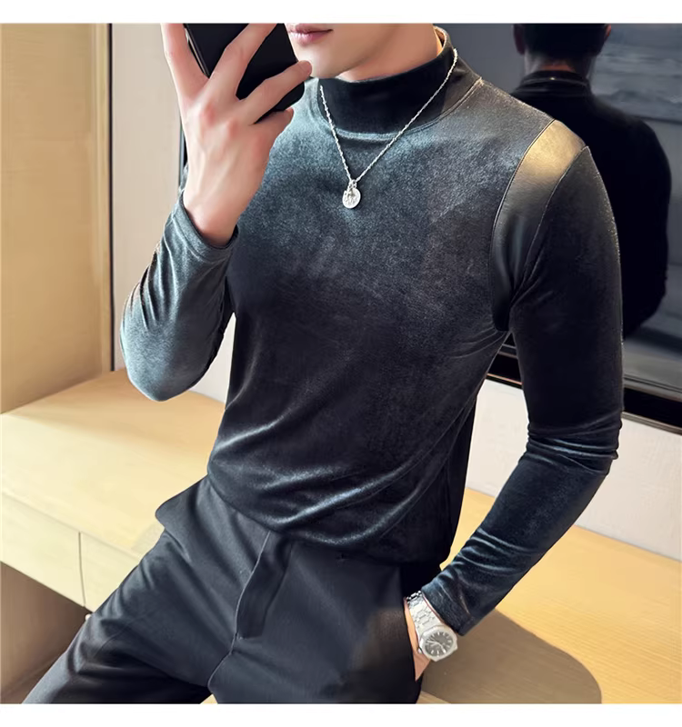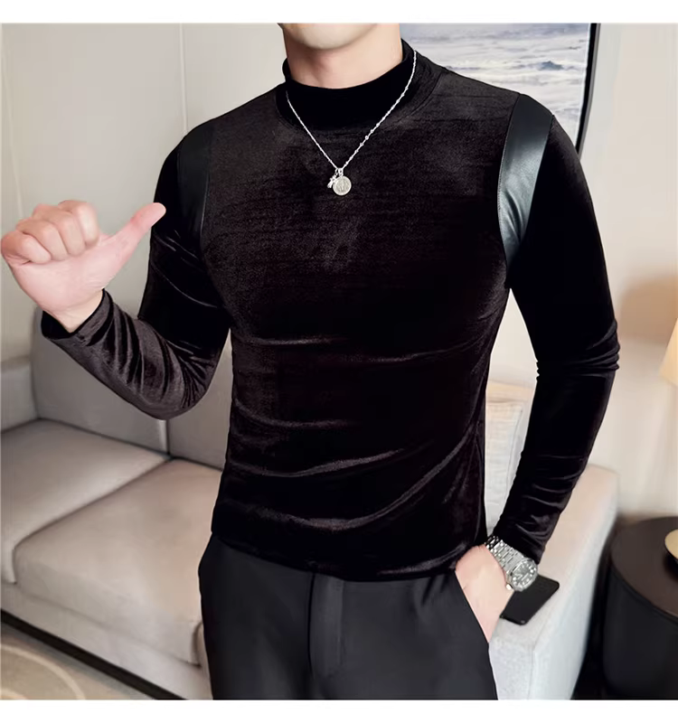 Áo sơ mi nam chất liệu nhung phối da, áo thun dài tay, lót lông cừu dày dặn mùa thu đông, cổ trung, dáng ôm.