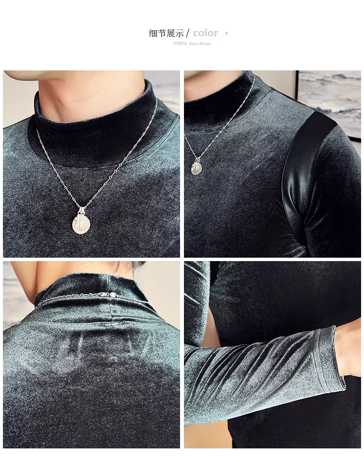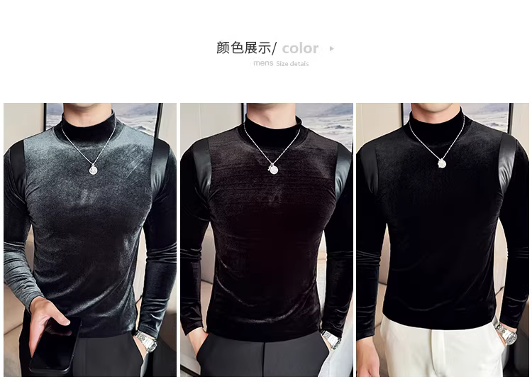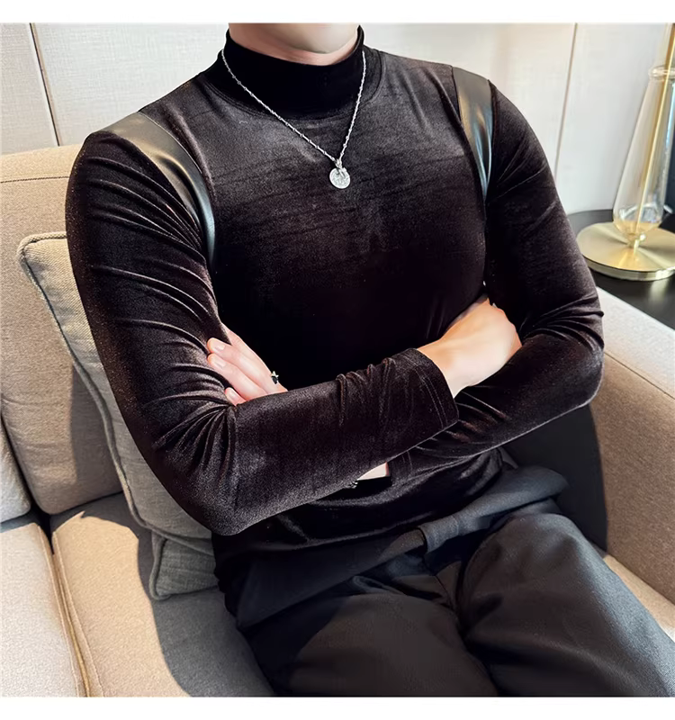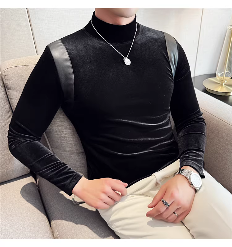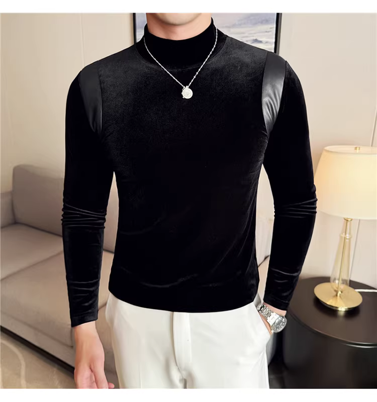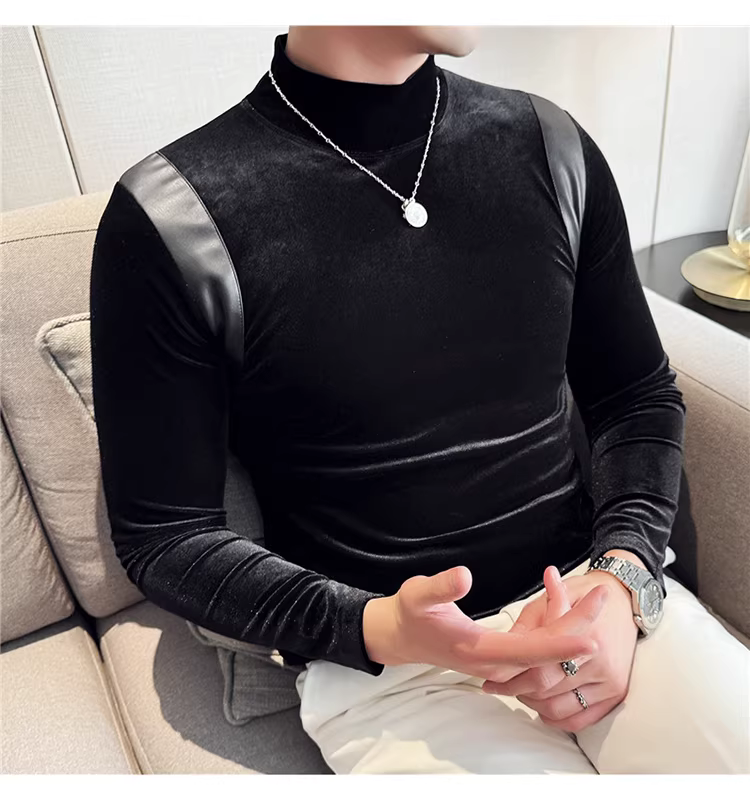 Áo sơ mi nam chất liệu nhung phối da, áo thun dài tay, lót lông cừu dày dặn mùa thu đông, cổ trung, dáng ôm.