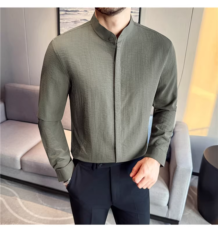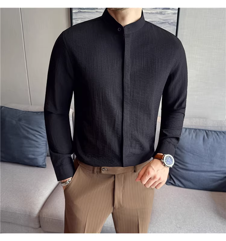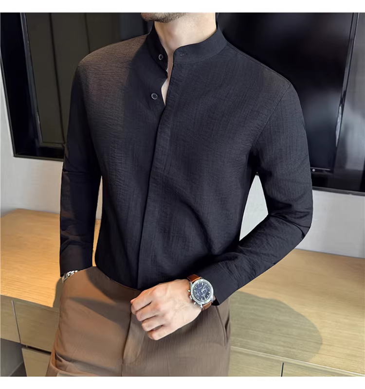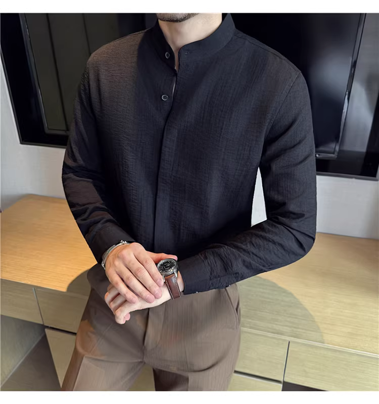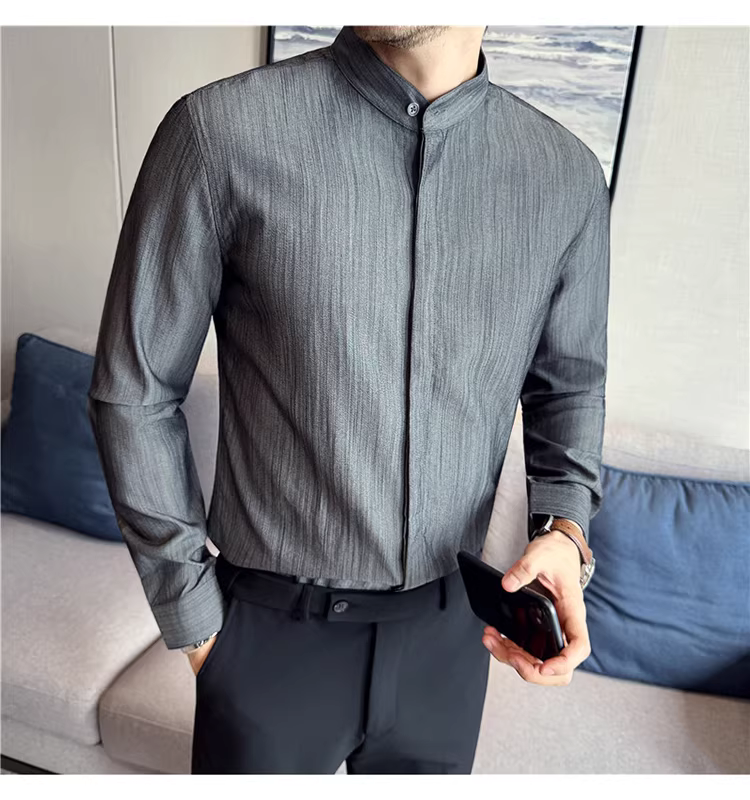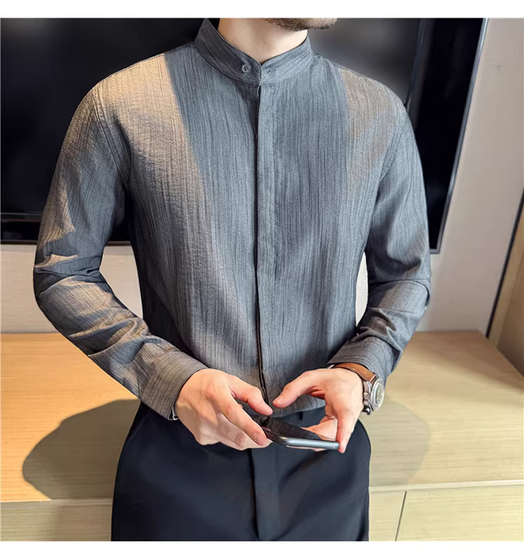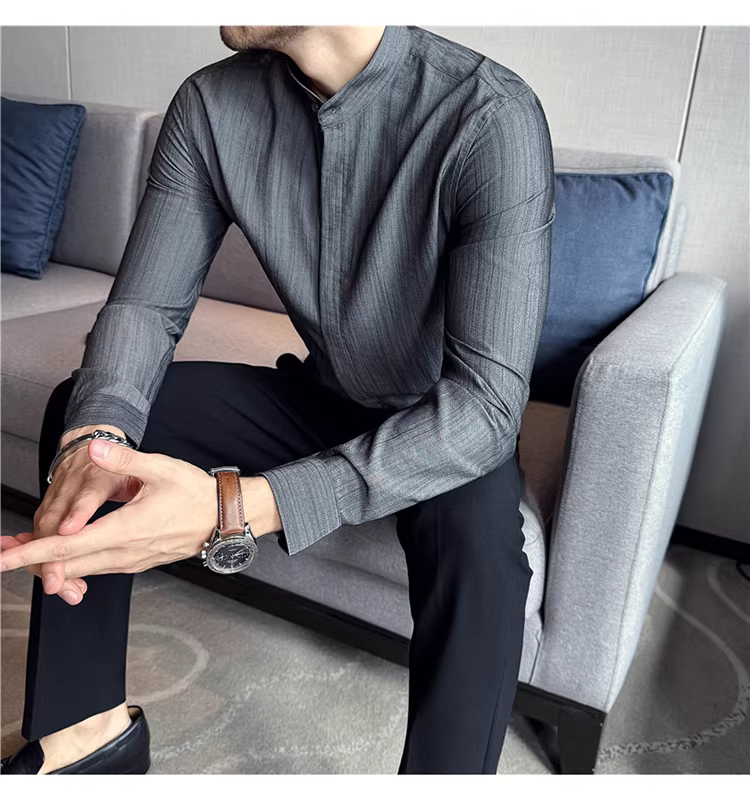 - Áo sơ mi nam cổ đứng kiểu Trung Hoa, chất liệu có vân, tay dài, kiểu dáng mới thu đông 2025, dễ chăm sóc, phong cách công sở lịch sự, kẻ sọc tối màu