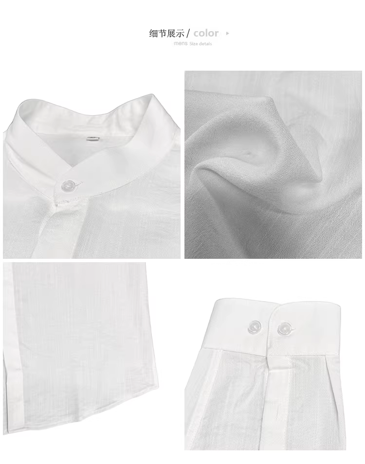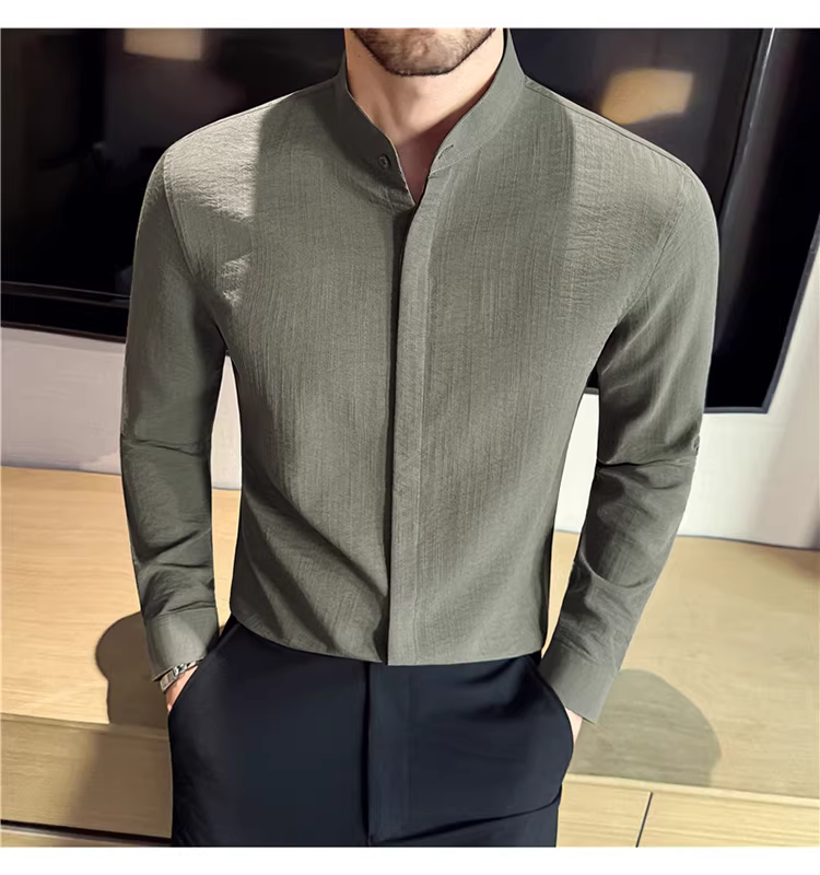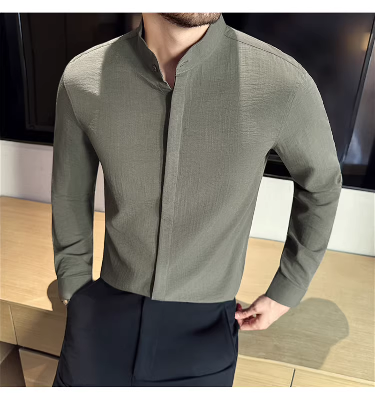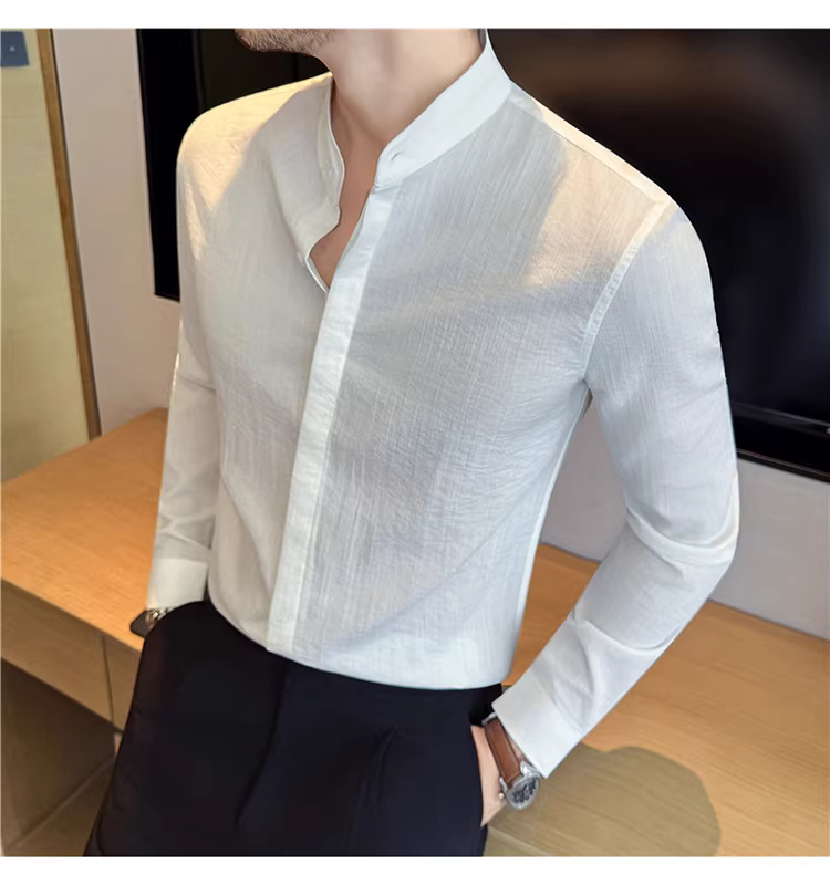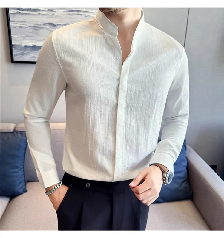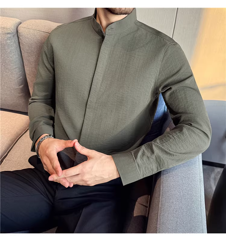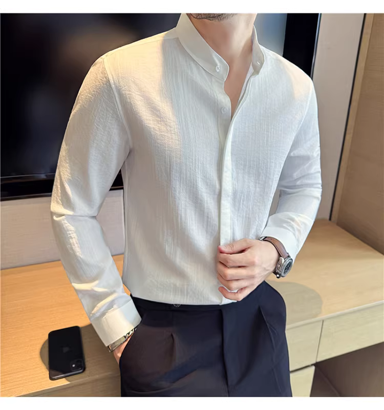 - Áo sơ mi nam cổ đứng kiểu Trung Hoa, chất liệu có vân, tay dài, kiểu dáng mới thu đông 2025, dễ chăm sóc, phong cách công sở lịch sự, kẻ sọc tối màu