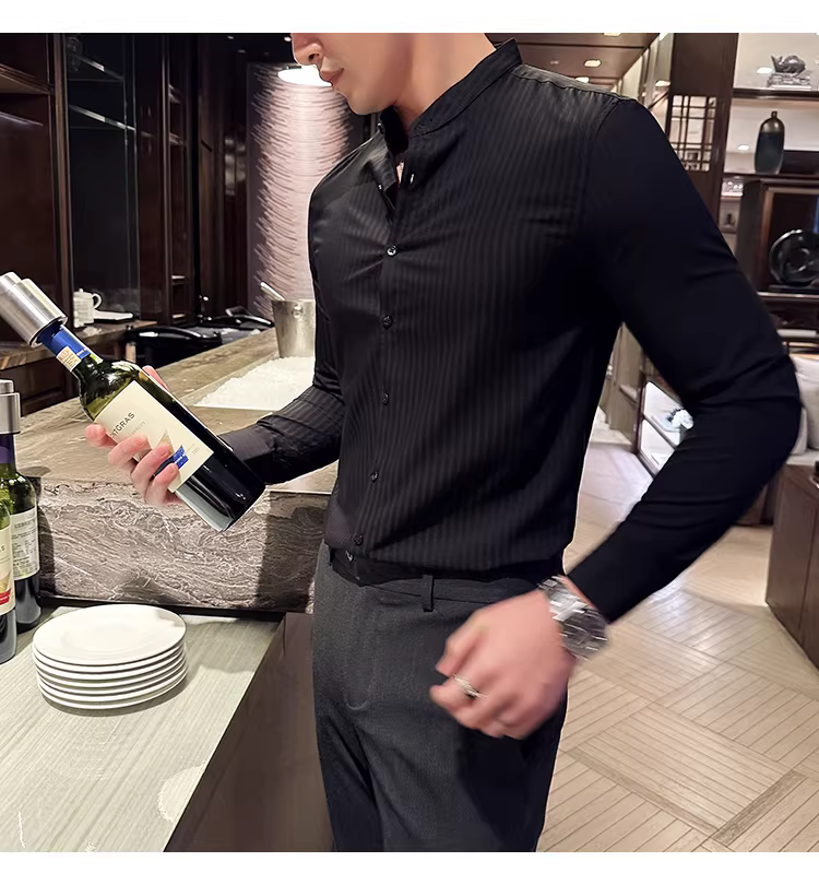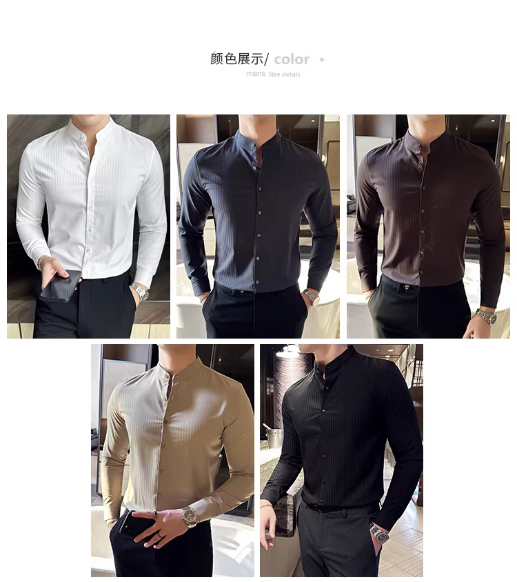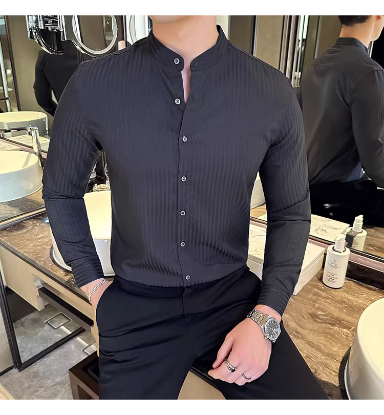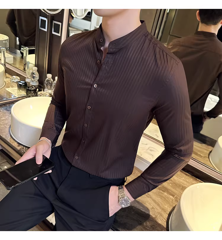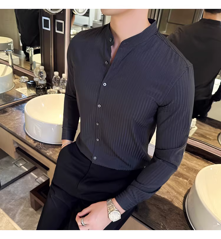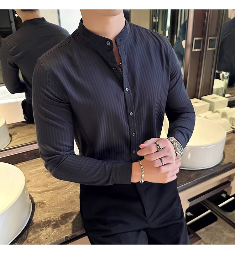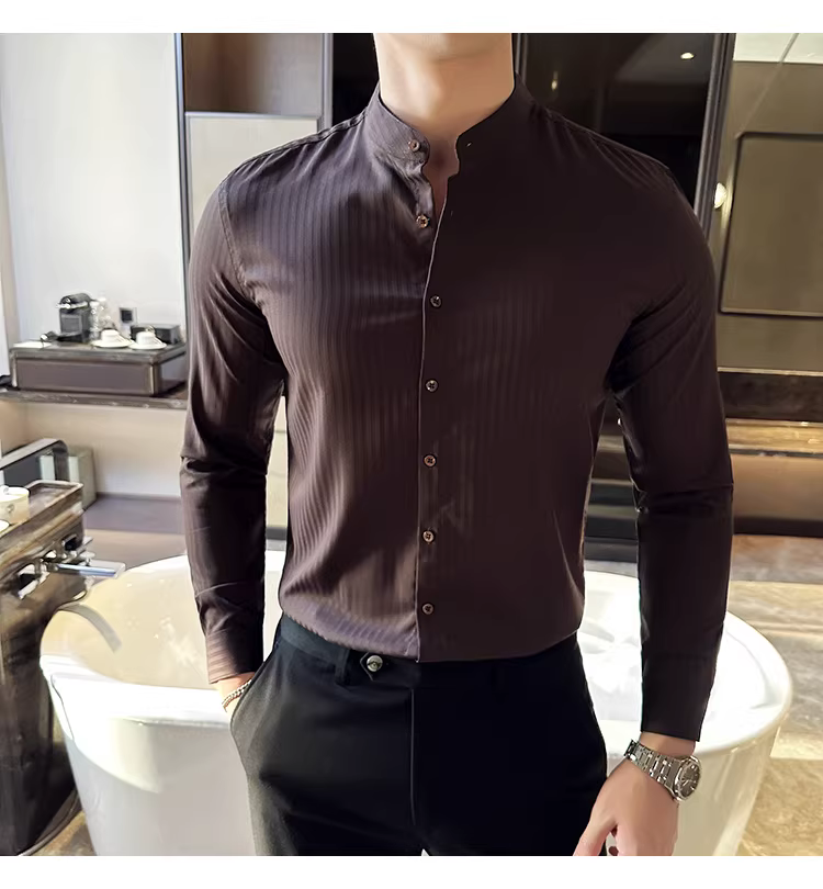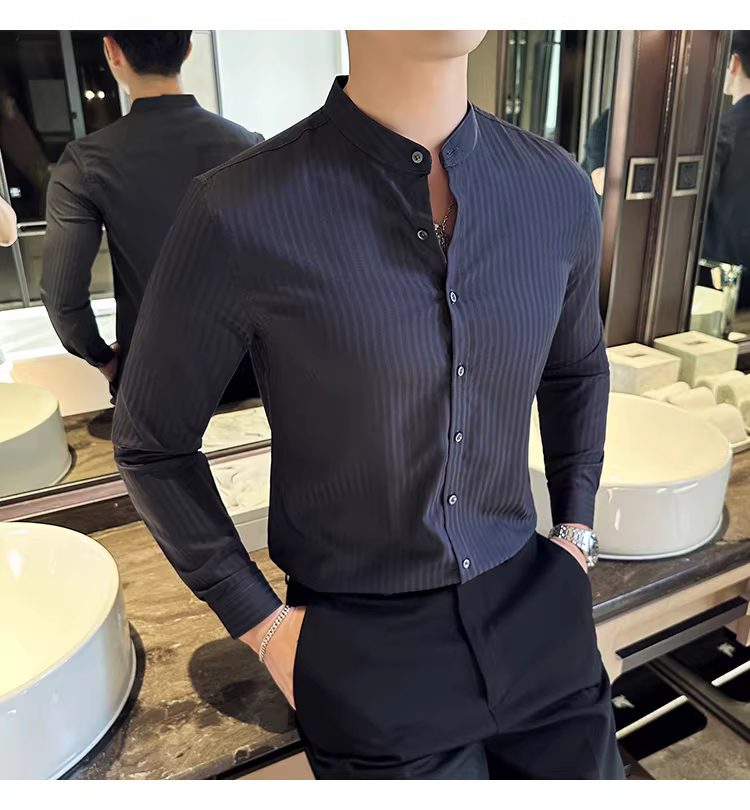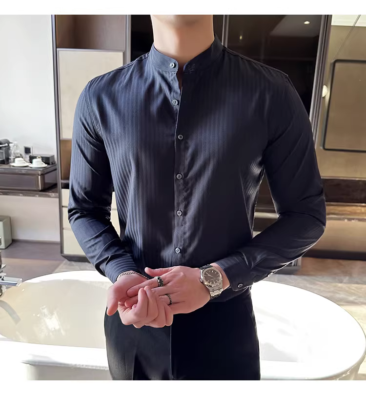 - Áo sơ mi nam cổ đứng sọc tối màu, dài tay, phong cách công sở giản dị, đa năng, thời trang, ôm dáng, phong cách Anh, áo cổ tròn cao cấp