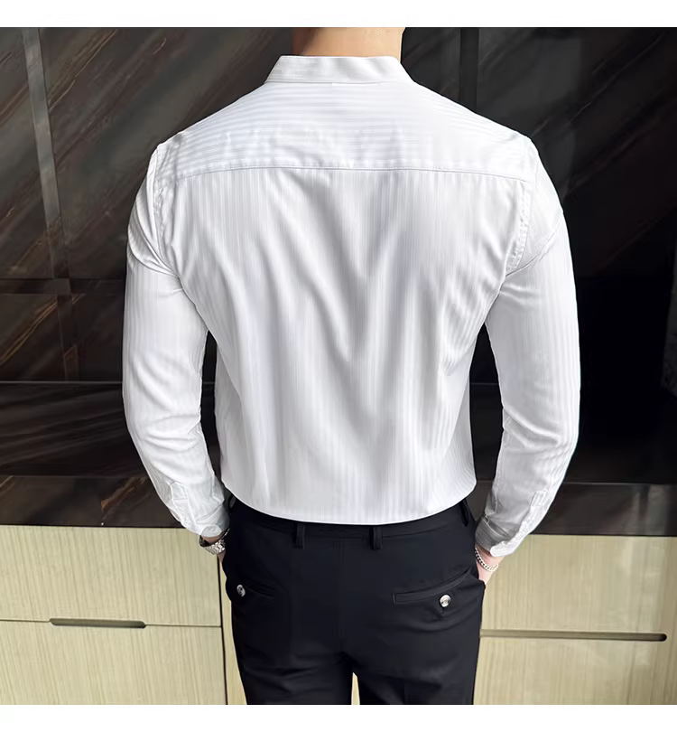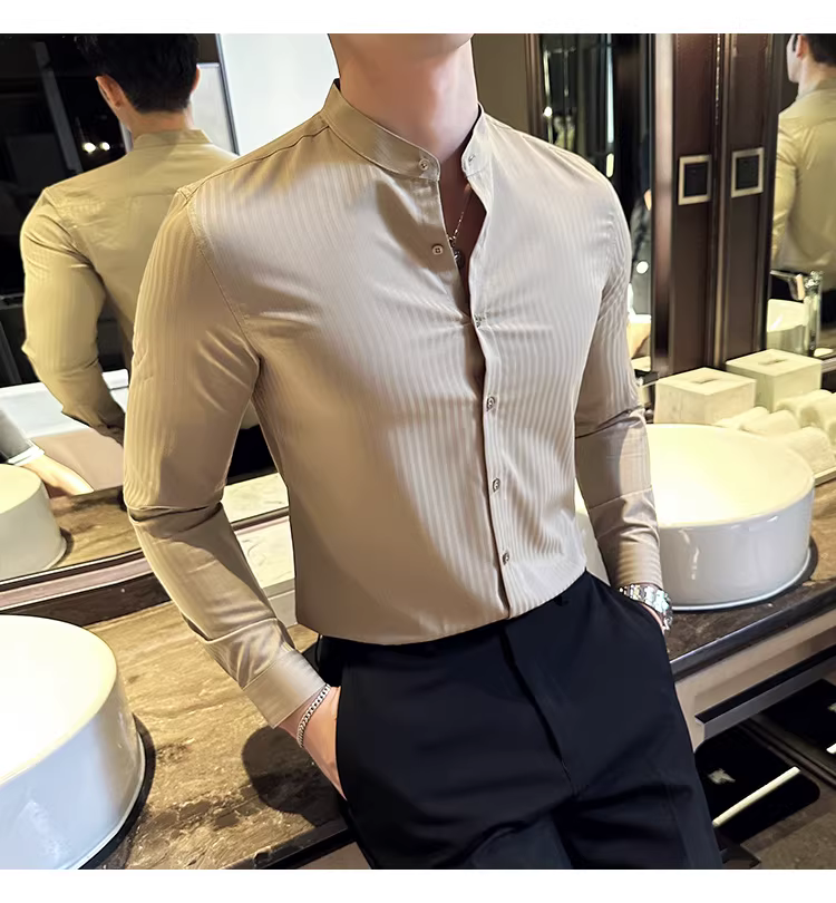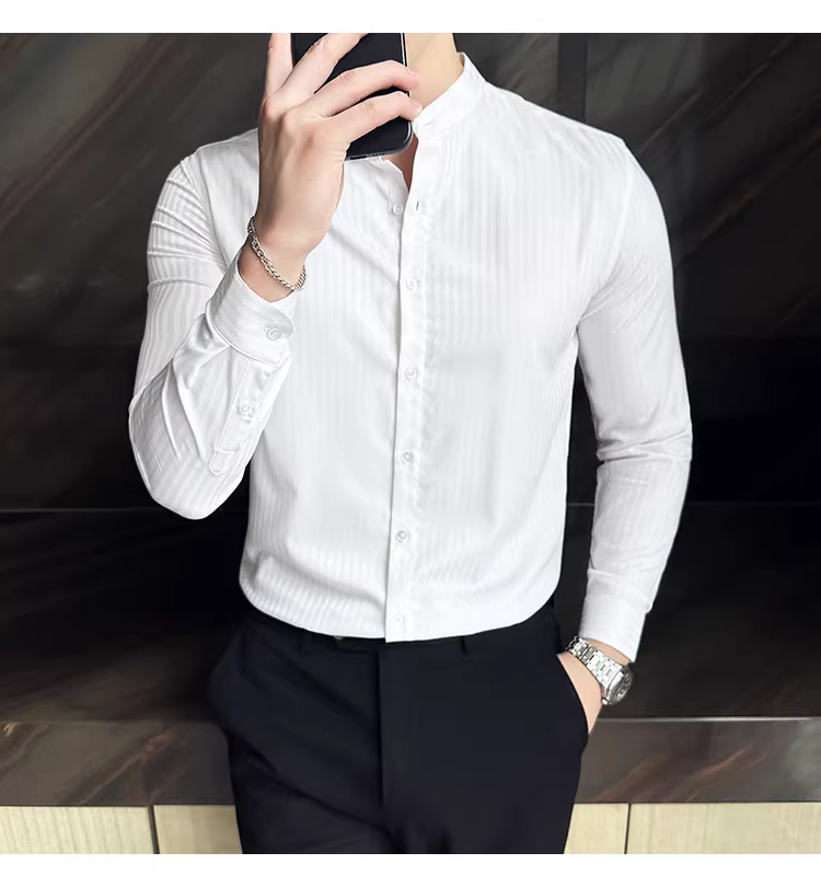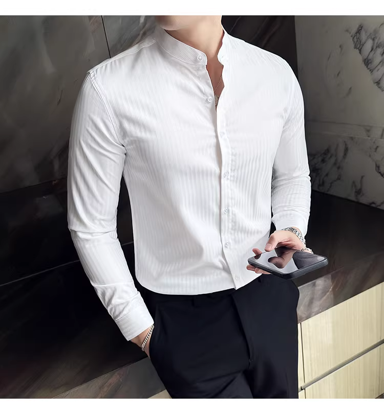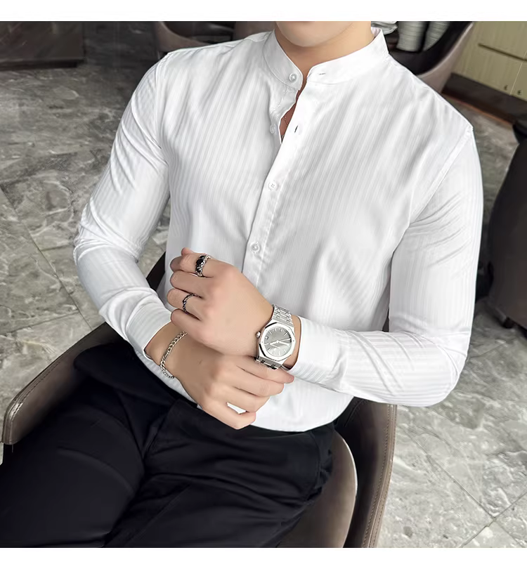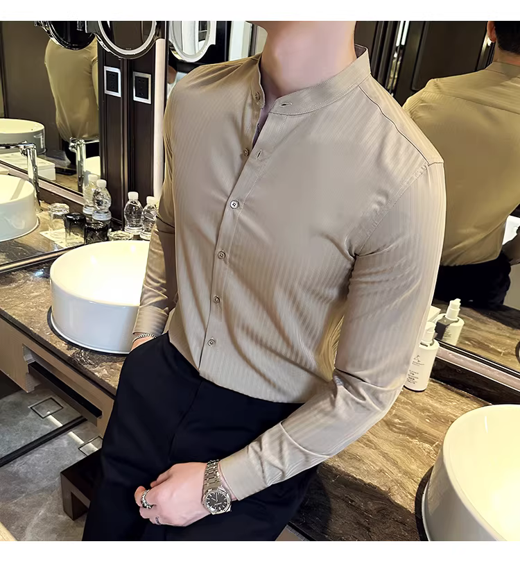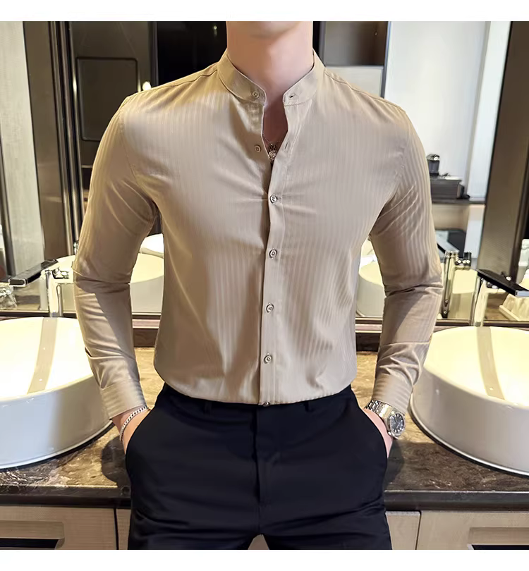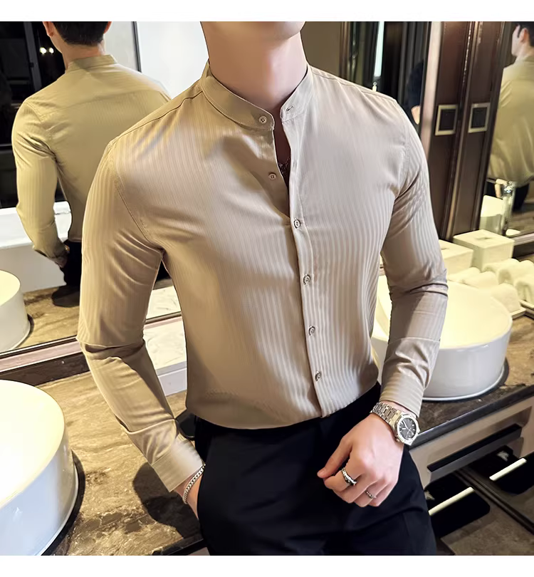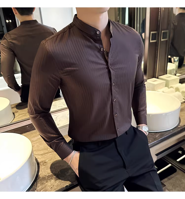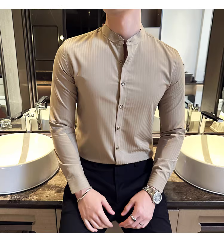 - Áo sơ mi nam cổ đứng sọc tối màu, dài tay, phong cách công sở giản dị, đa năng, thời trang, ôm dáng, phong cách Anh, áo cổ tròn cao cấp