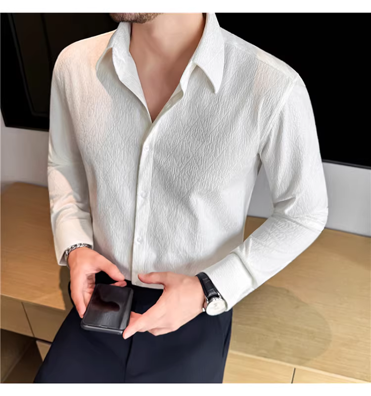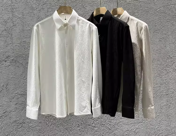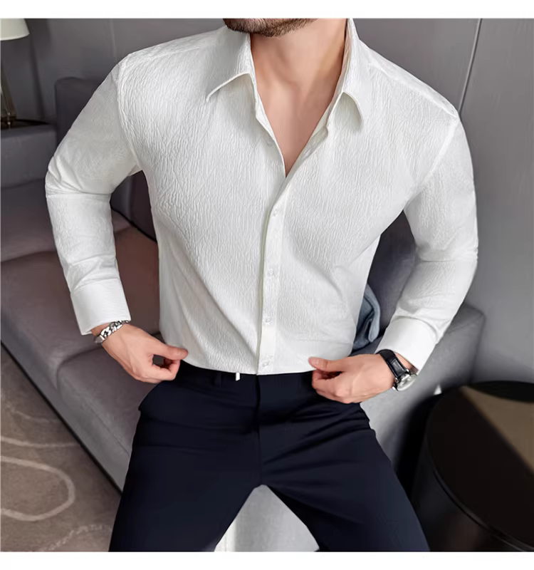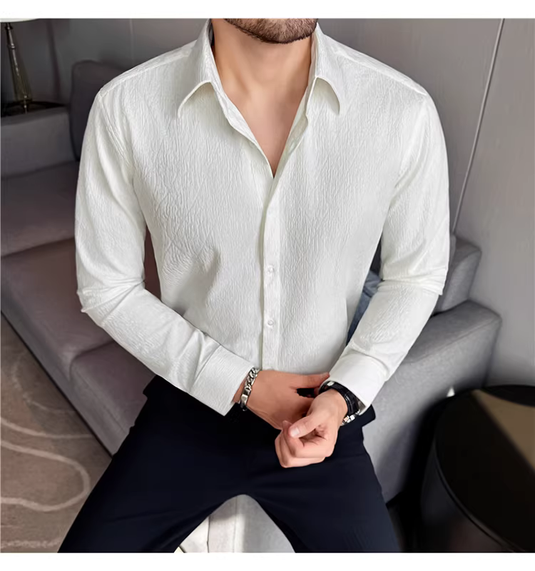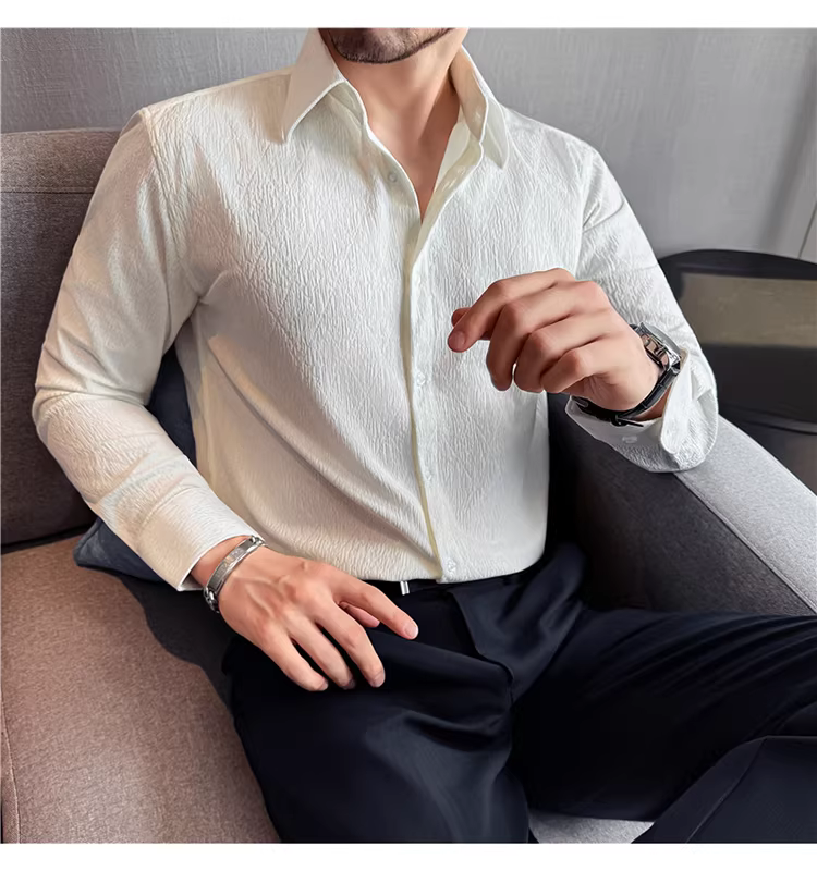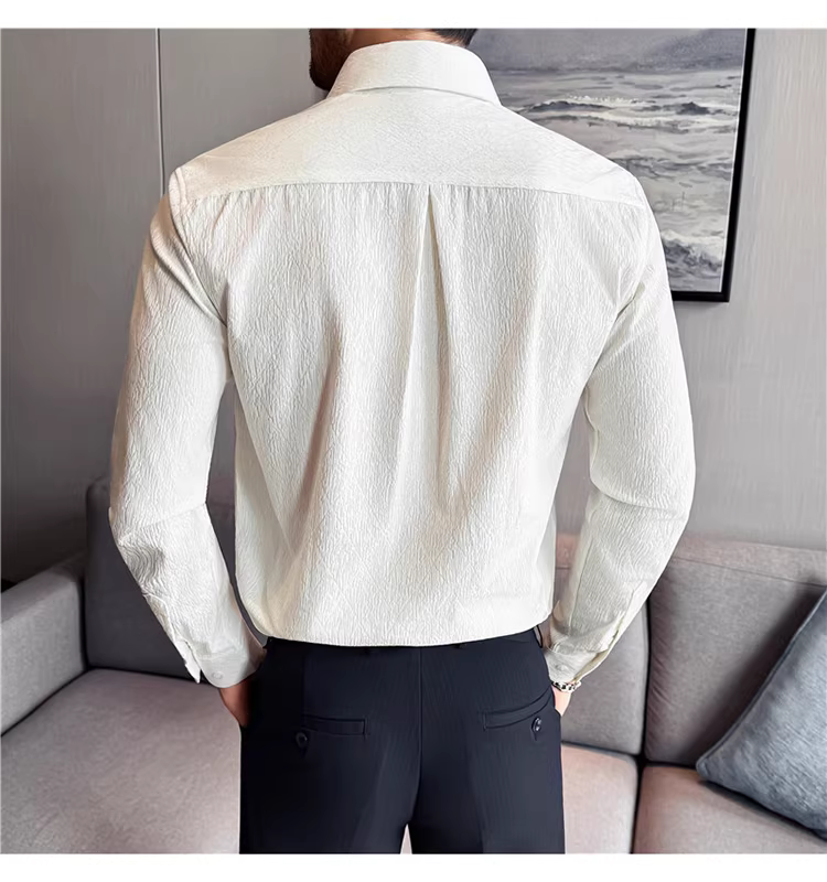 - Áo sơ mi nam cổ trụ kiểu Pháp, tay dài, chất liệu jacquard cao cấp kẻ ô vuông hình thoi, màu trắng