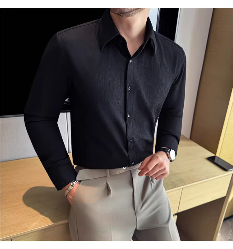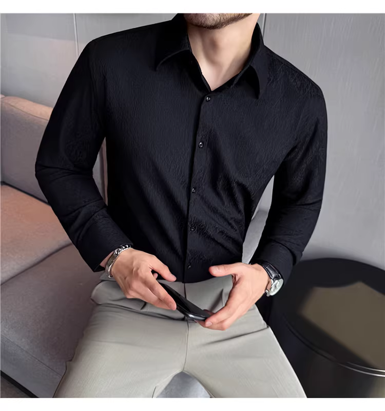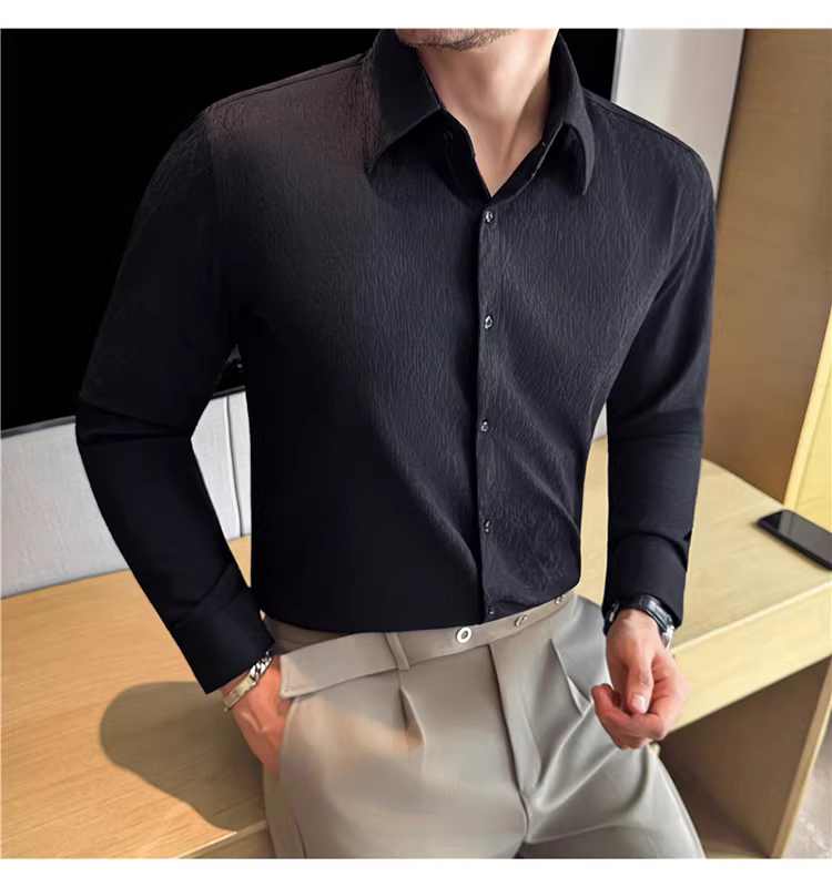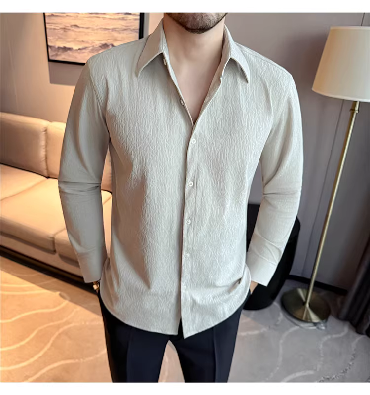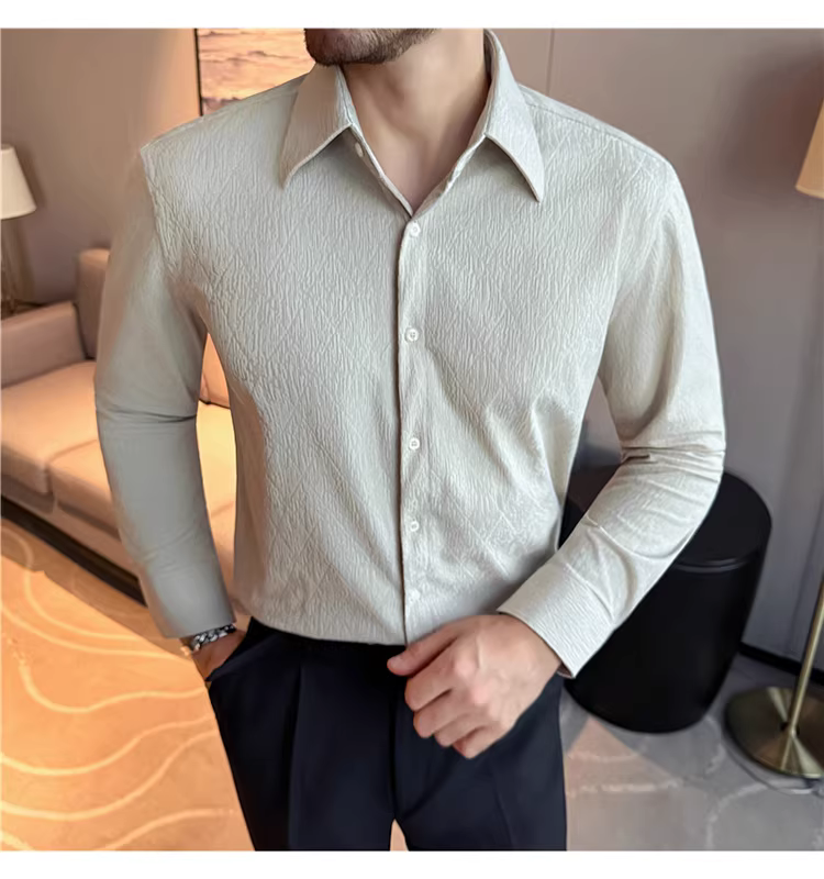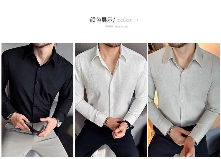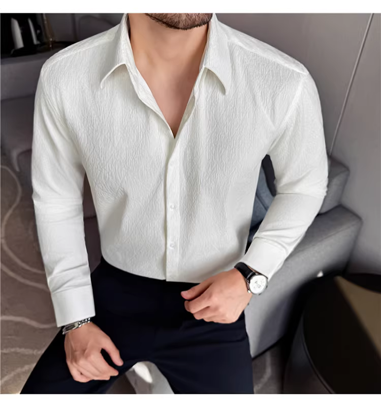 - Áo sơ mi nam cổ trụ kiểu Pháp, tay dài, chất liệu jacquard cao cấp kẻ ô vuông hình thoi, màu trắng