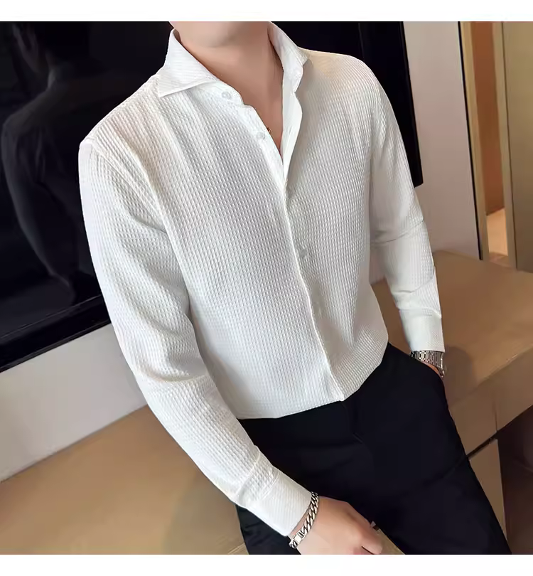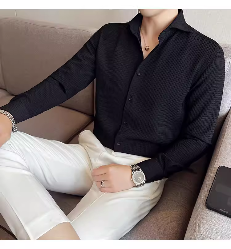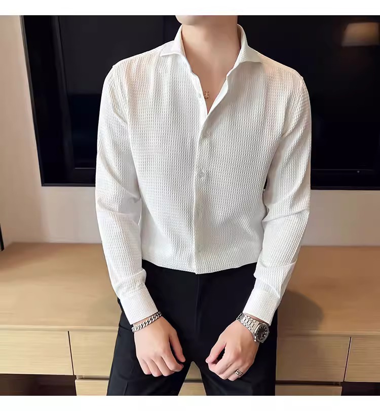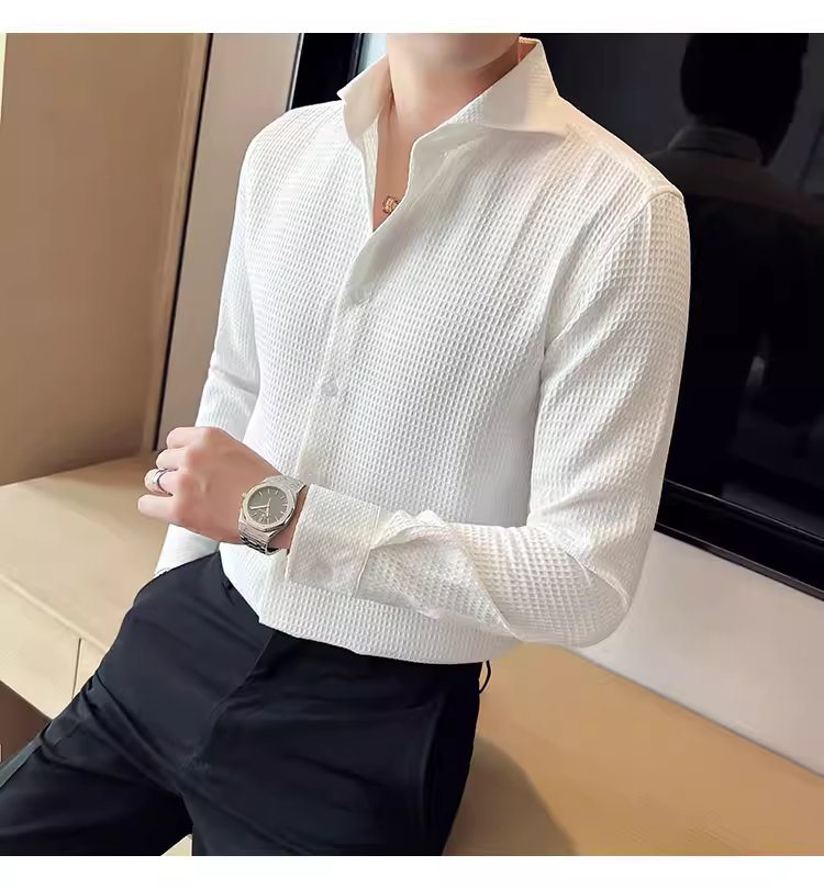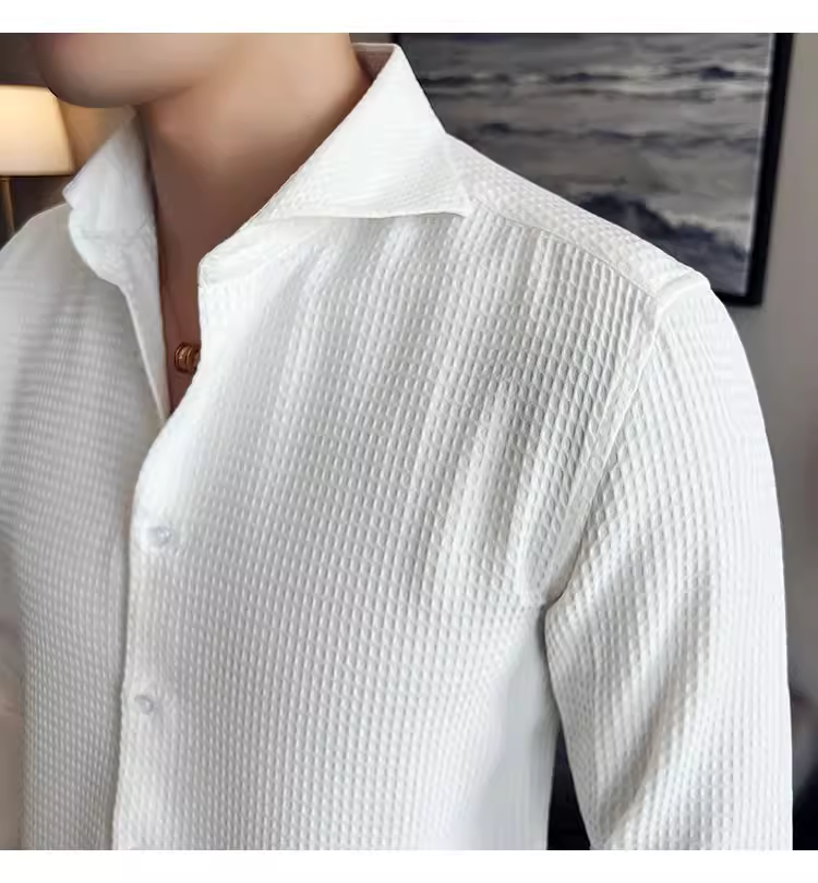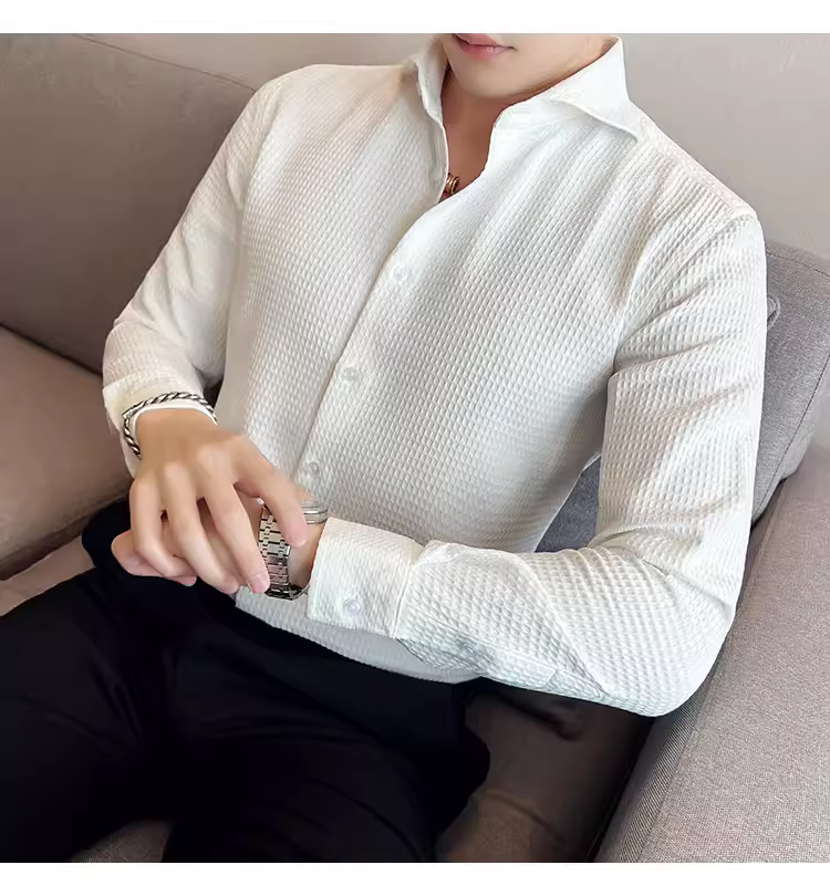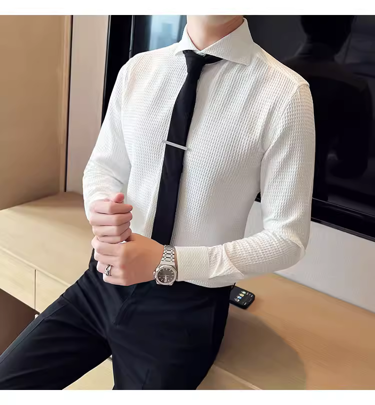 - Áo sơ mi nam cổ Windsor một đường may, tay dài, họa tiết waffle cao cấp, dáng ôm, phong cách công sở lịch sự, trang phục công sở chuyên nghiệp, áo kiểu Pháp