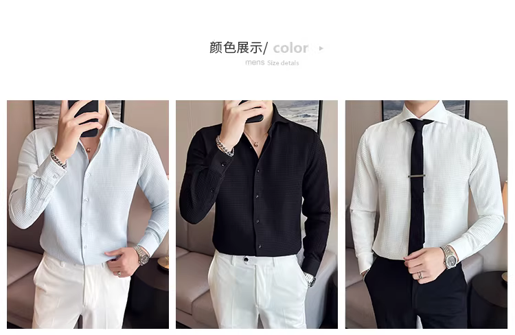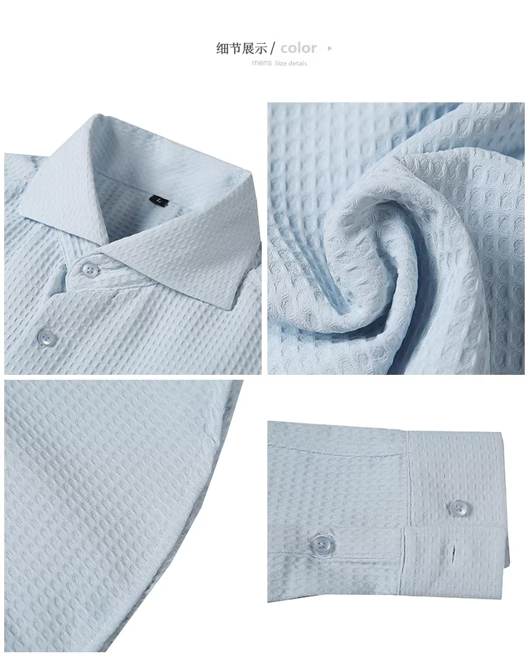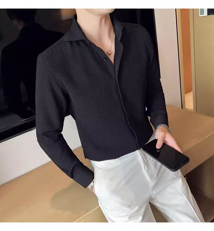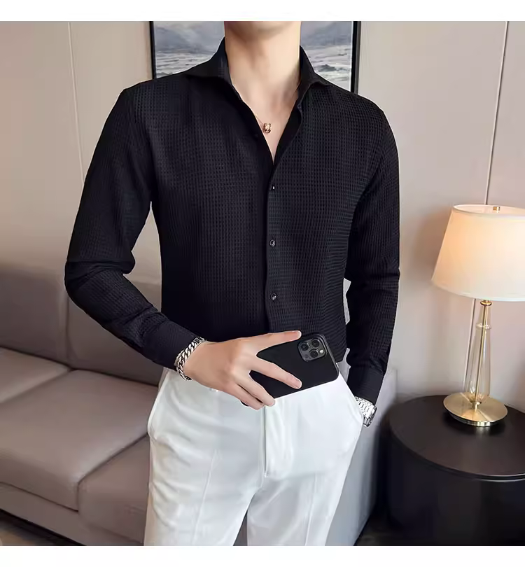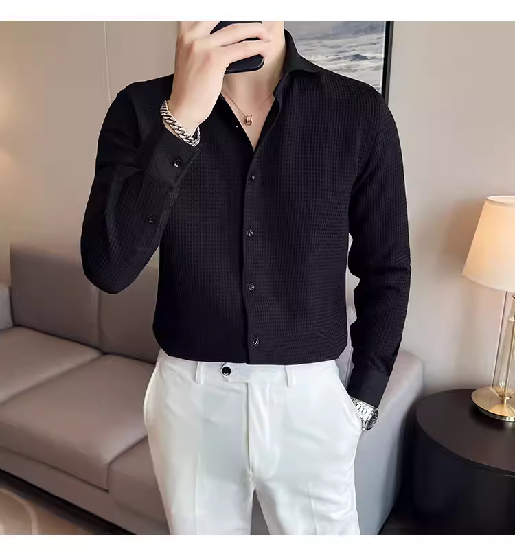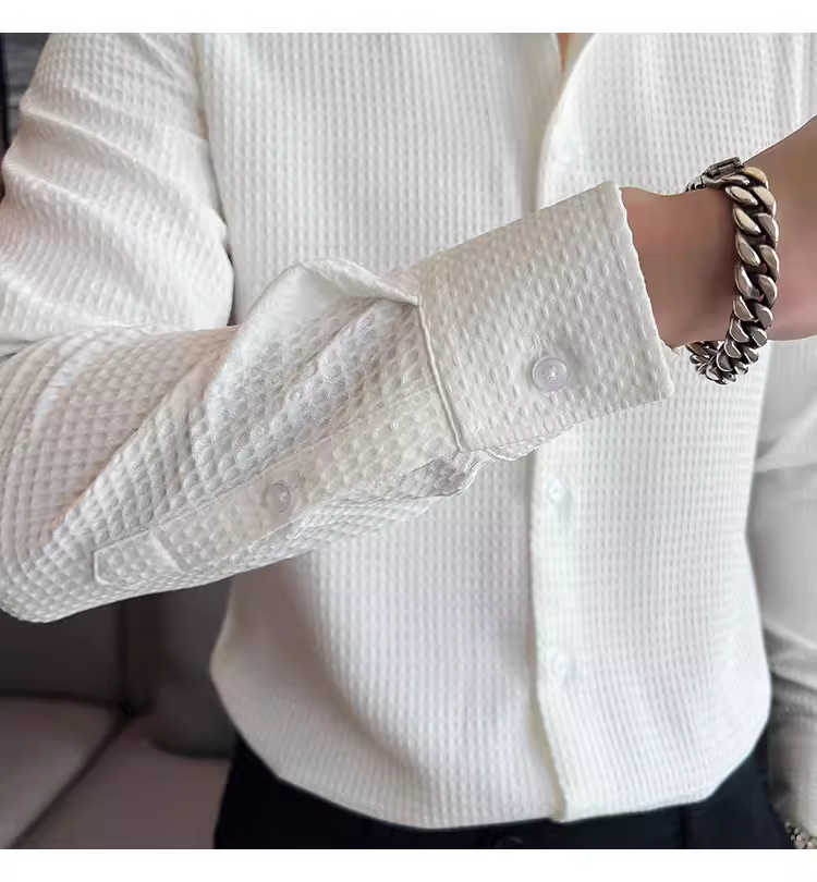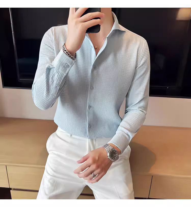 - Áo sơ mi nam cổ Windsor một đường may, tay dài, họa tiết waffle cao cấp, dáng ôm, phong cách công sở lịch sự, trang phục công sở chuyên nghiệp, áo kiểu Pháp